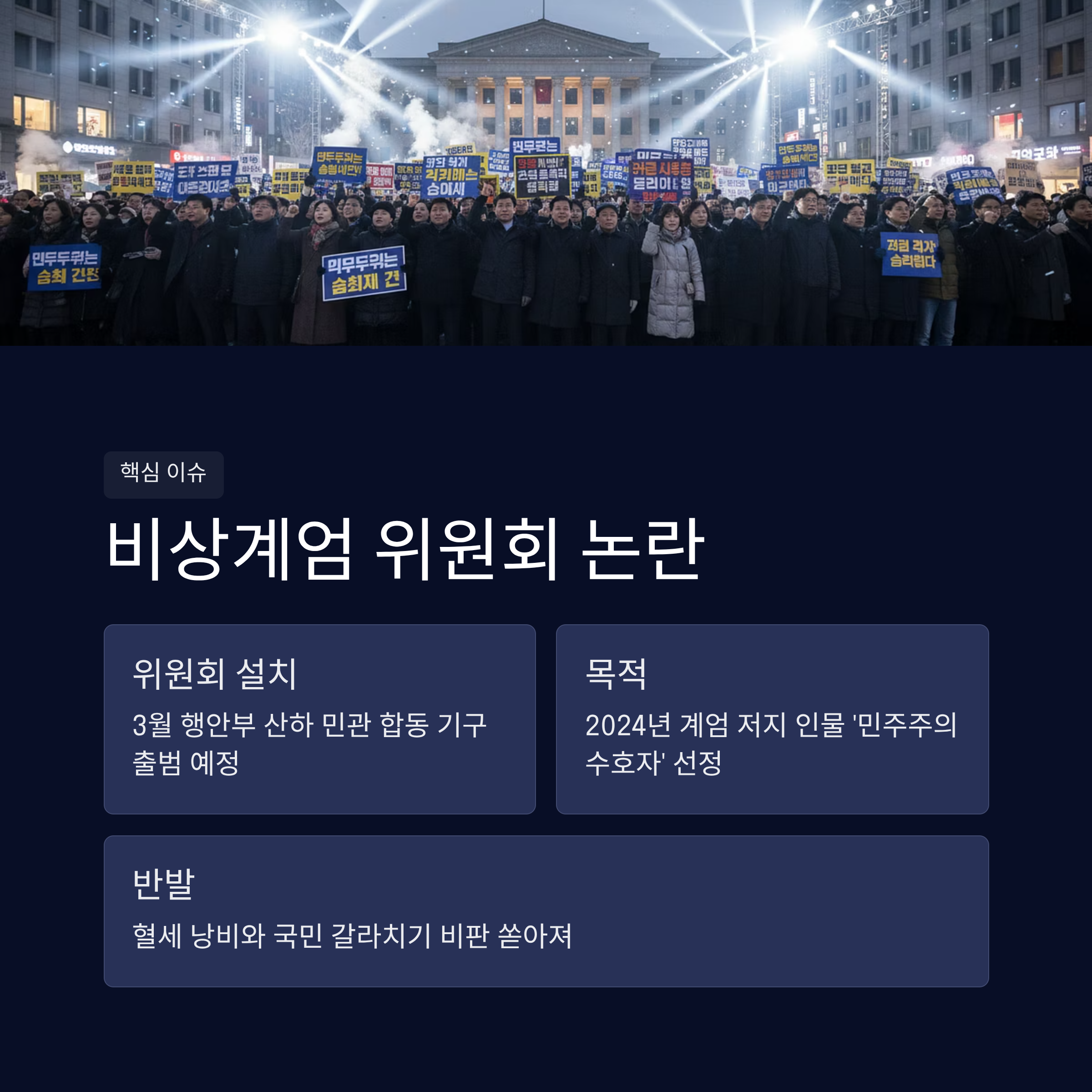 2026년 2월 9일 현재, 이재명 정부가 행정안전부 산하에 가칭 '비상계엄 위원회'를 설치하고 오는 3월부터 운영하겠다고 밝혀 논란이 일고 있습니다. 해당 위원회는 2년 전인 2024년 12월 발생했던 비상계엄 사태 당시, 계엄을 저지한 인물들을 '민주주의 수호자'로 선정해 예우하는 것을 목적으로 합니다. 하지만 네티즌과 야권(국민의힘)에서는 불과 수 시간 만에 종료된 해프닝 성격의 사건을 두고 혈세를 투입해 유공자를 만든다는 것에 대해 "뜬금없다", "언제까지 우려먹을 것이냐"는 비판을 쏟아내고 있습니다. 결국 비상계엄 유공자 위원회 설치는 혈세 낭비와 국민 갈라치기 논란이라는 거센 파도에 직면했습니다. 본 글에서는 해당 위원회 설치의 문제점과 그 이면에 깔린 정치적 셈법을 심층적으로 분석합니다.