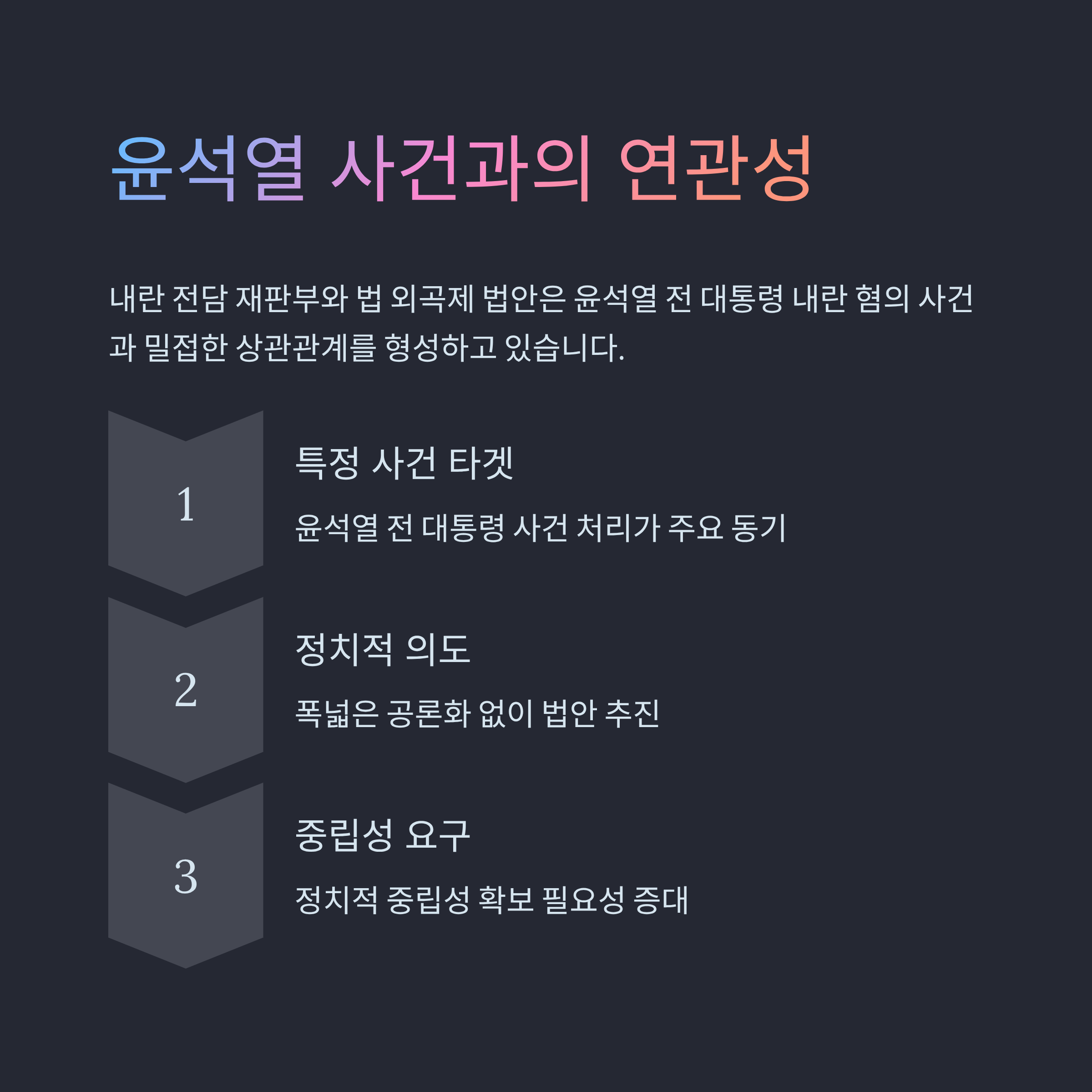 이와 같은 법안 논란은 윤석열 전 대통령 사건과 밀접한 상관관계를 형성해 정치적 중립성을 더욱 요구하는 상황입니다.