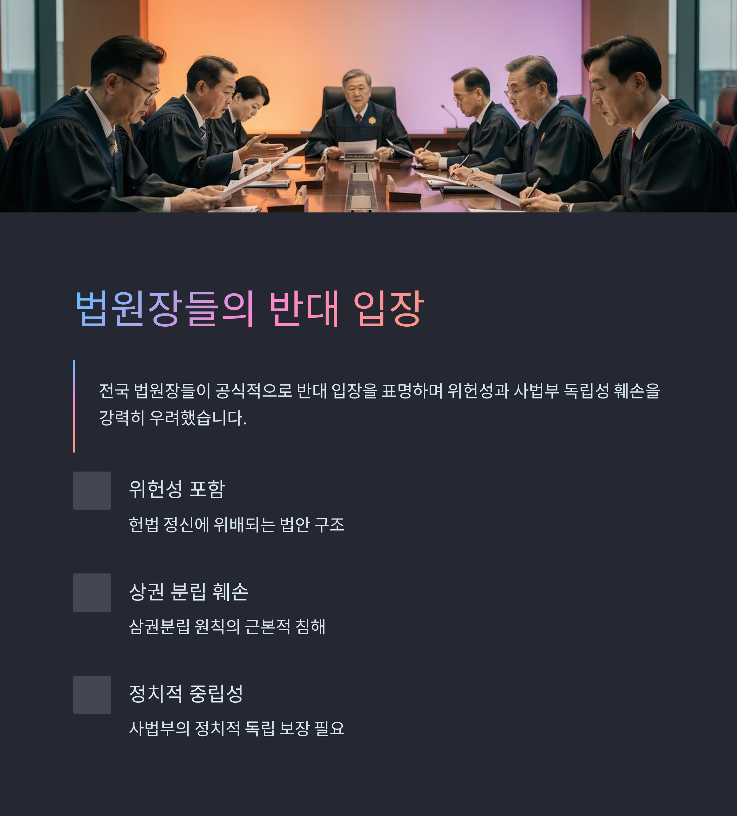 사법부는 해당 법안이 위헌성을 포함해 상권 분립 원칙 훼손을 우려하며 반대하고 있습니다.
