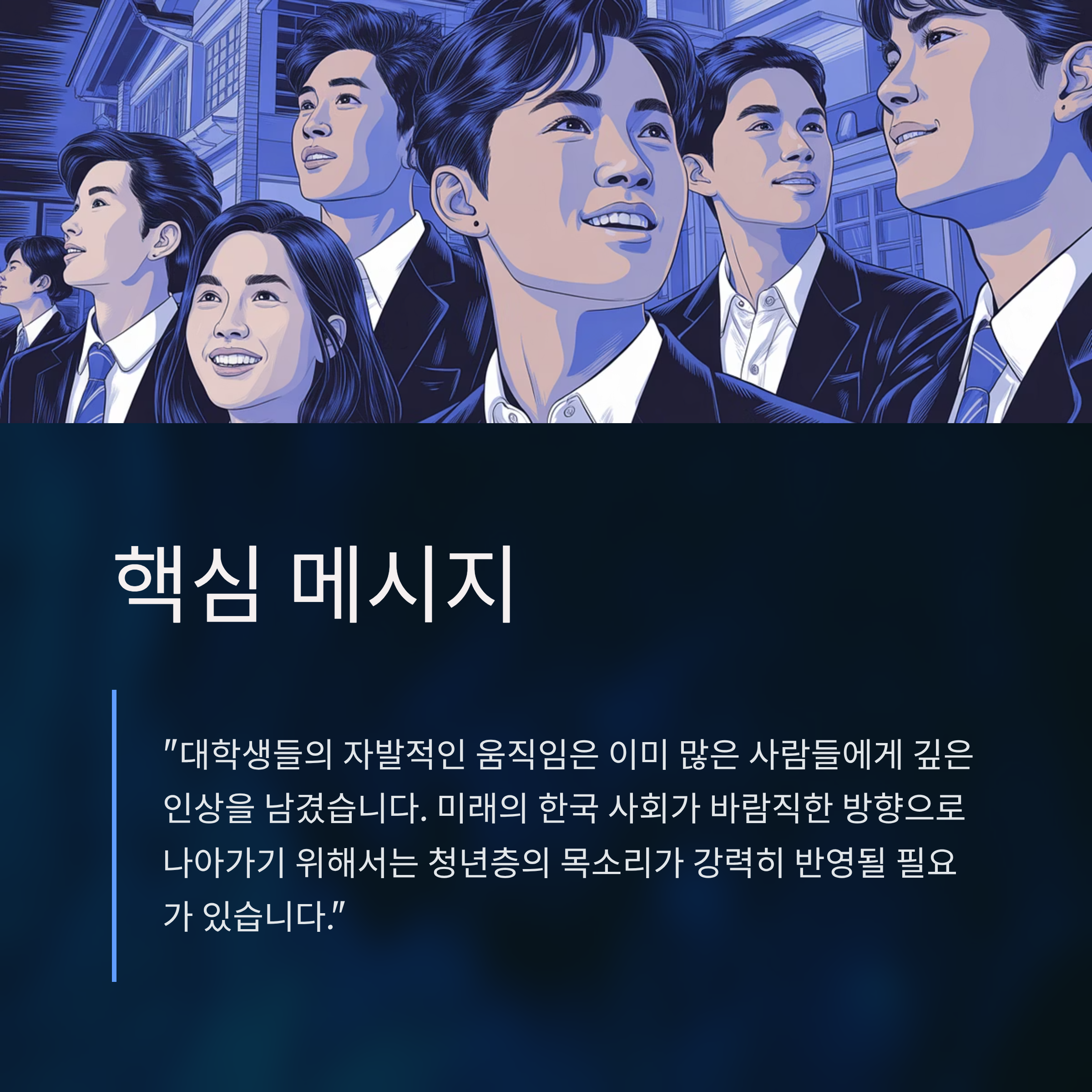 이 대자보로 시작된 비판적 담론이 대한민국의 미래와 민주주의 발전에 어떠한 실질적인 결과를 도출할지는 여전히 미지수지만, 대학생들의 이러한 자발적인 움직임은 이미 많은 사람들에게 깊은 인상을 남겼습니다. 미래의 한국 사회가 바람직한 방향으로 나아가기 위해서는 이러한 청년층의 목소리가 강력히 반영될 필요가 있습니다.