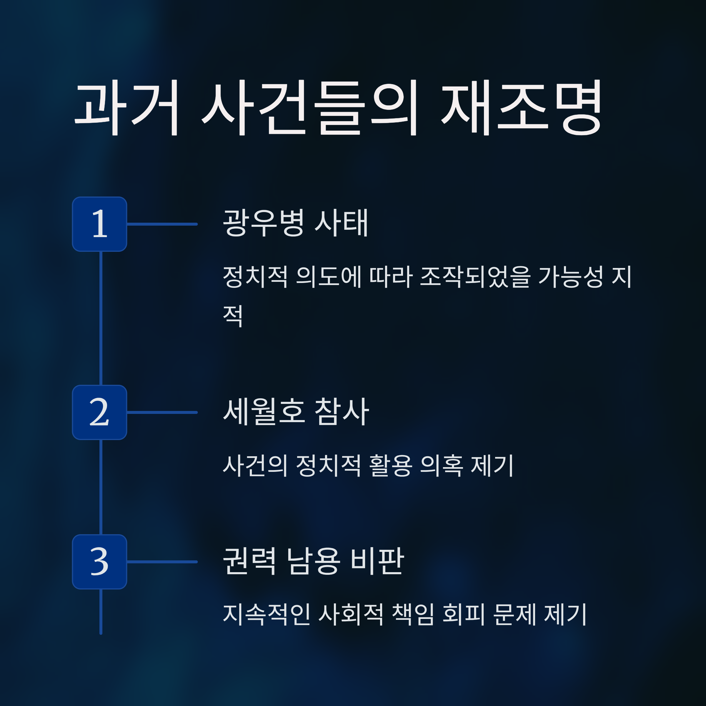 세 번째로, 대자보는 민주당의 정치적 행보와 사회 전반에서 차별화된 진실 추구의 부재를 비판했습니다. 트루스 포럼은 광우병 사태, 세월호 참사 등 과거 사건들을 거론하며, 이들 사건이 정치적 의도에 따라 조작되었을 가능성을 지적했습니다. 이러한 사건들을 비판함으로써 이들이 사회적 책임을 다하지 못했으며, 지속적으로 권력을 남용해 왔다고 결론지었습니다.
