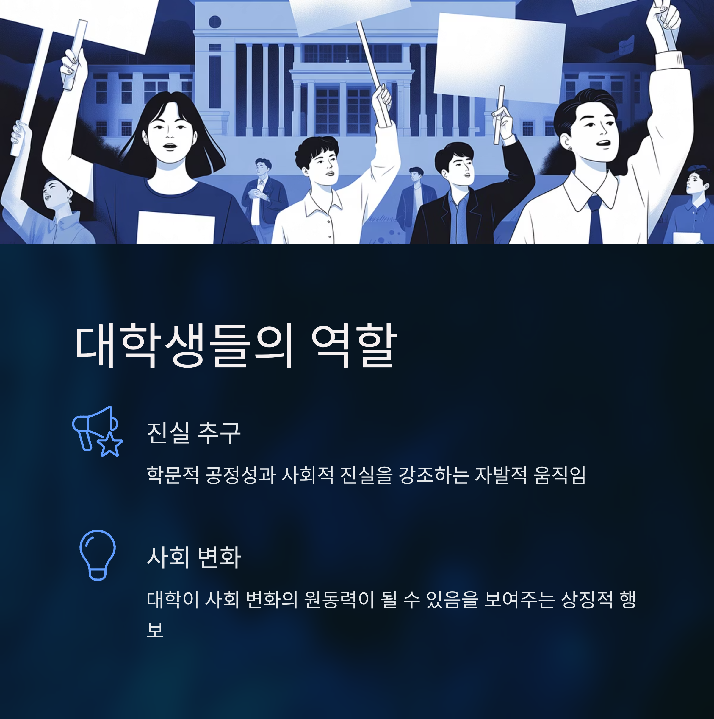 사회적 비판은 단순히 정치를 향한 비난에 머물지 않았습니다. 학생들은 학문적 공정성과 진실의 추구를 강조하며, 대학이라는 공간에서 스스로의 역할을 다하겠다는 의지를 표현했습니다. 이는 대학이 단지 학업의 장을 넘어 사회 변화의 원동력이 될 수 있음을 보여주는 상징적 행보로 평가받습니다.