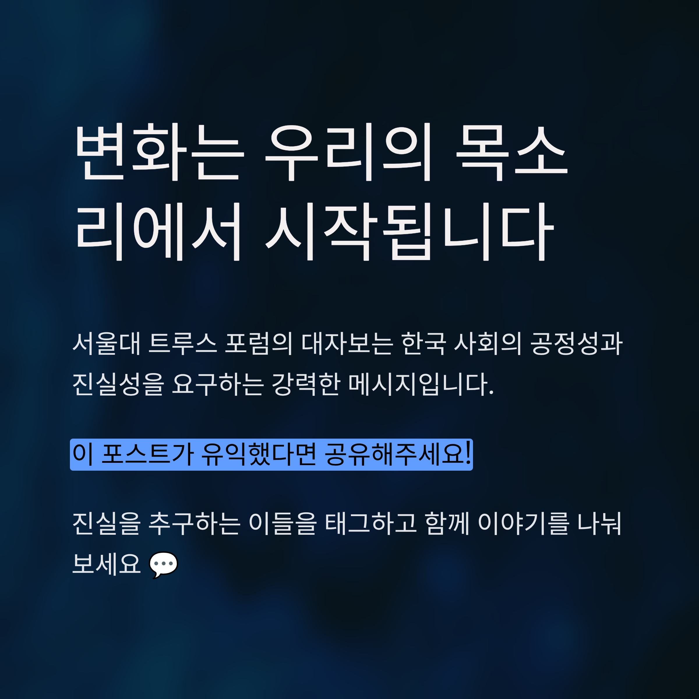 서울대 트루스 포럼의 대자보는 한국 사회에서 흔히 부각되지 않는 문제를 날카롭게 지적하며, 대학생들의 사회적 역할이 지대함을 보여줬습니다. 윤석열 전 대통령 탄핵 사례, 대장동 사건의 미진한 사법 처리, 그리고 학문적 진리 추구의 중요성을 동시에 다룬 이 글은 단지 대학생들의 목소리를 넘어 사회 전반의 공정성과 진실성 구현을 요구하는 강력한 메시지를 담고 있습니다. 이제는 사회 각계에서 이 목소리를 실제 변화를 이루는 동력으로 삼아야 할 때입니다.