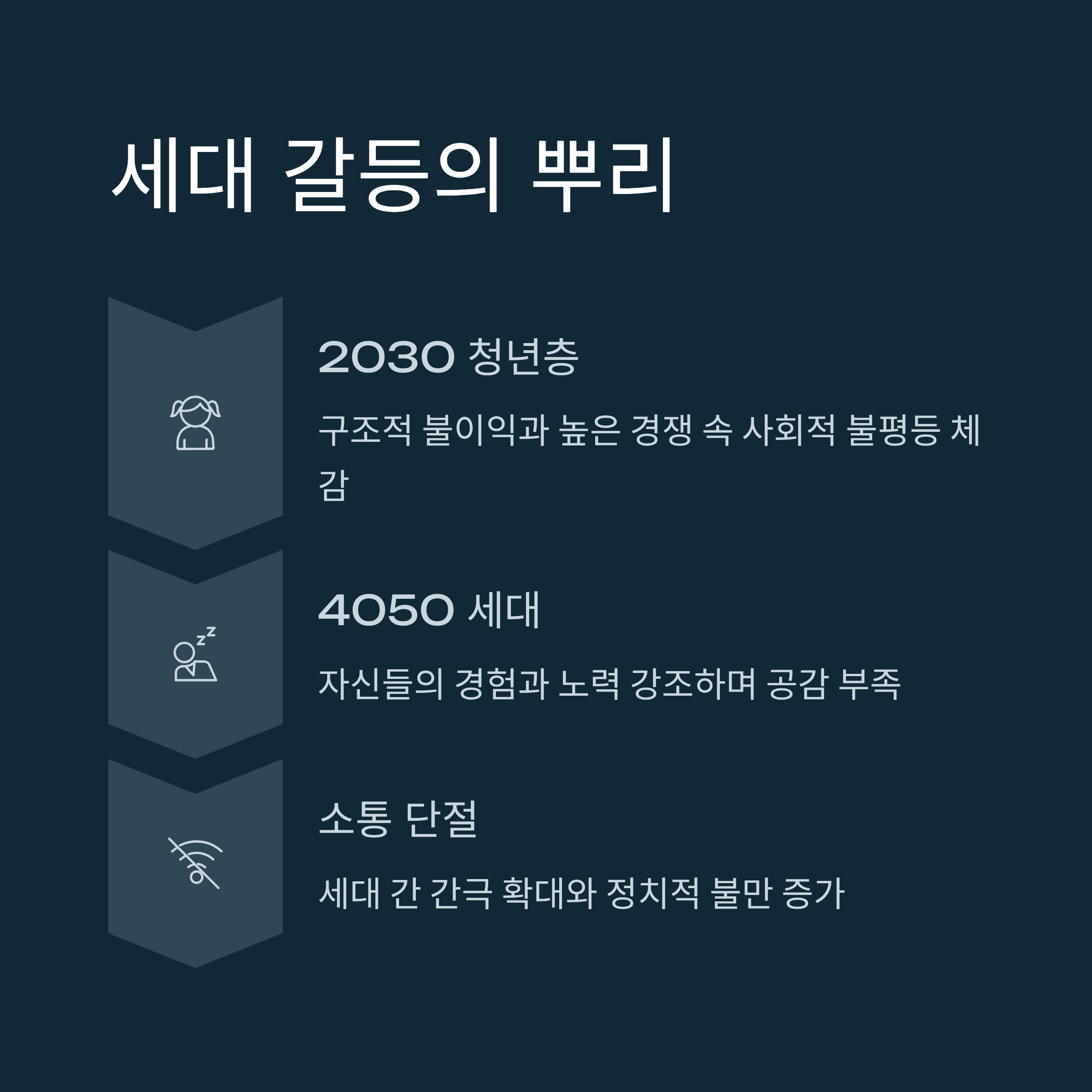 세대 갈등은 뿌리 깊은 문제로 자리잡아 왔으며 현재 대한민국 청년층(2030세대)은 사회적 불평등과 높은 경쟁 속에서 구조적 불이익을 겪고 있다고 느끼고 있습니다. 반면 4050세대는 자신들의 경험과 노력을 강조하며, 세대 간의 공감 부족은 더 큰 간극을 불러오고 있습니다.