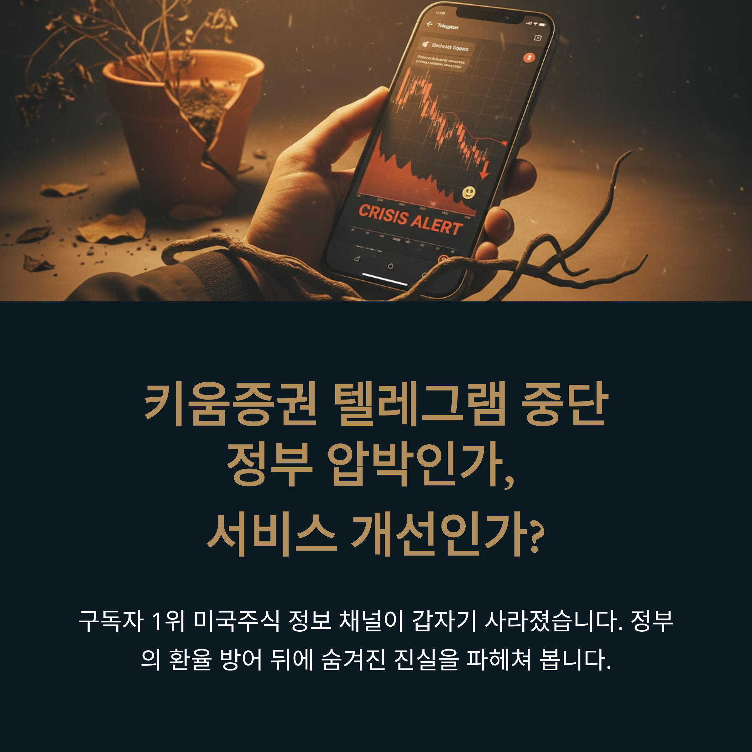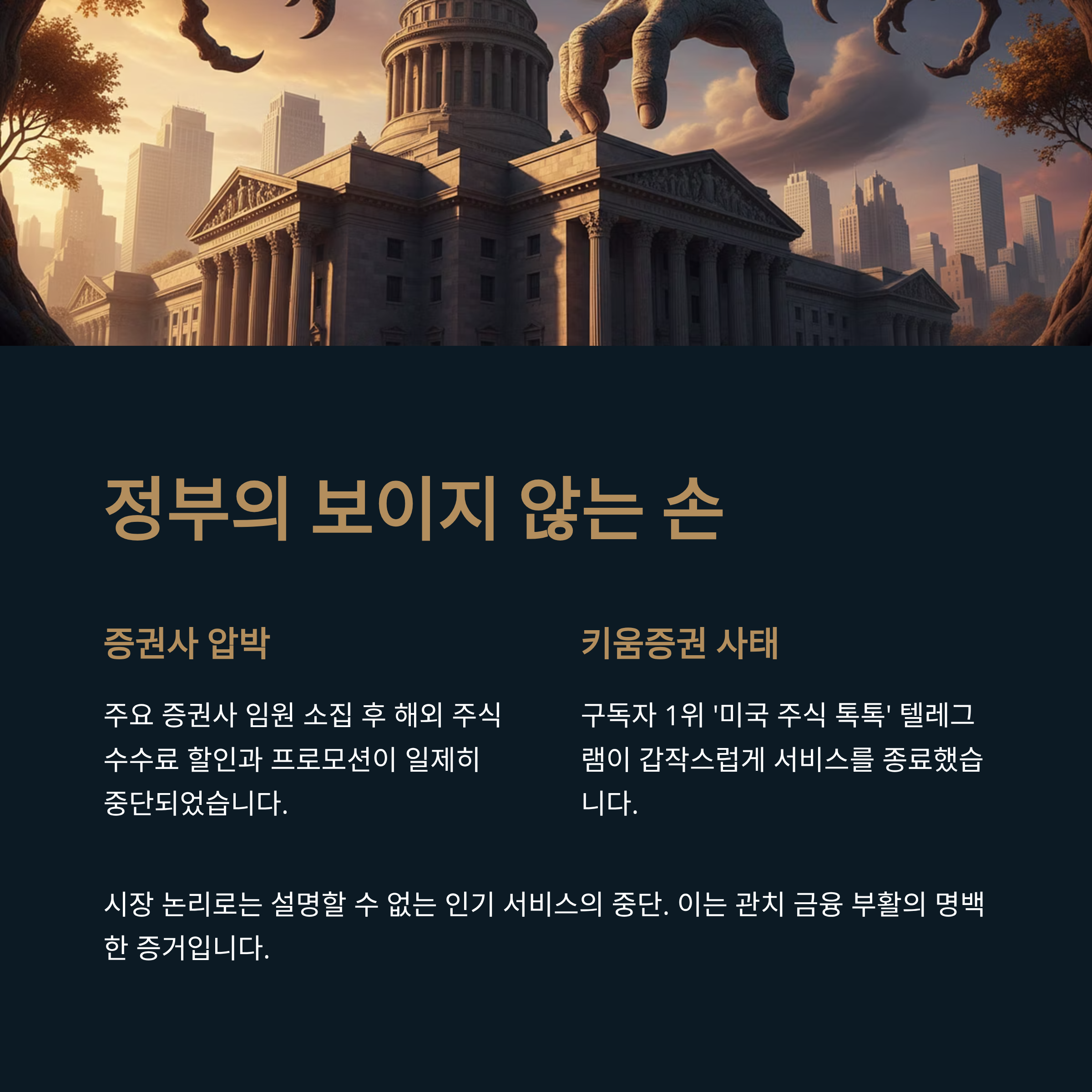 현 정부는 환율 상승의 책임을 개인 투자자에게 돌리며 노골적인 시장 개입에 나서고 있습니다. 최근 주요 증권사 임원들을 소집하여 해외 주식 투자 권유를 자제하라고 압박한 것이 대표적입니다. 이 간담회 직후, 증권사들은 일제히 해외 주식 수수료 할인 혜택과 투자 지원금 프로모션을 중단했습니다. 특히 구독자 1위였던 키움증권의 '미국 주식 톡톡' 텔레그램 서비스가 갑작스럽게 중단된 것은 정부의 압박이 실재한다는 명백한 증거로 여겨집니다. 시장 논리로는 설명할 수 없는 인기 서비스의 중단은 정부의 눈치를 본 '관치 금융'의 부활이라는 비판을 피하기 어렵습니다.
