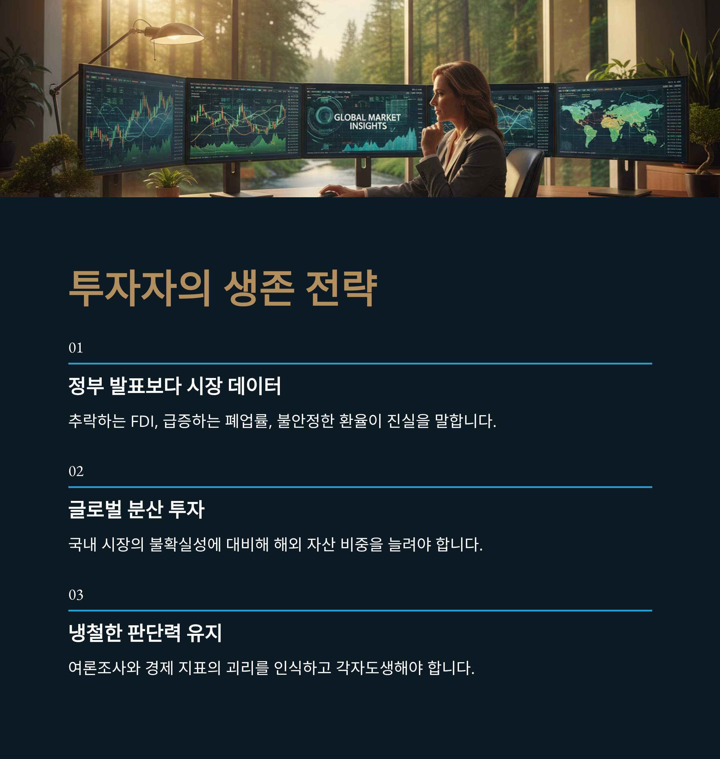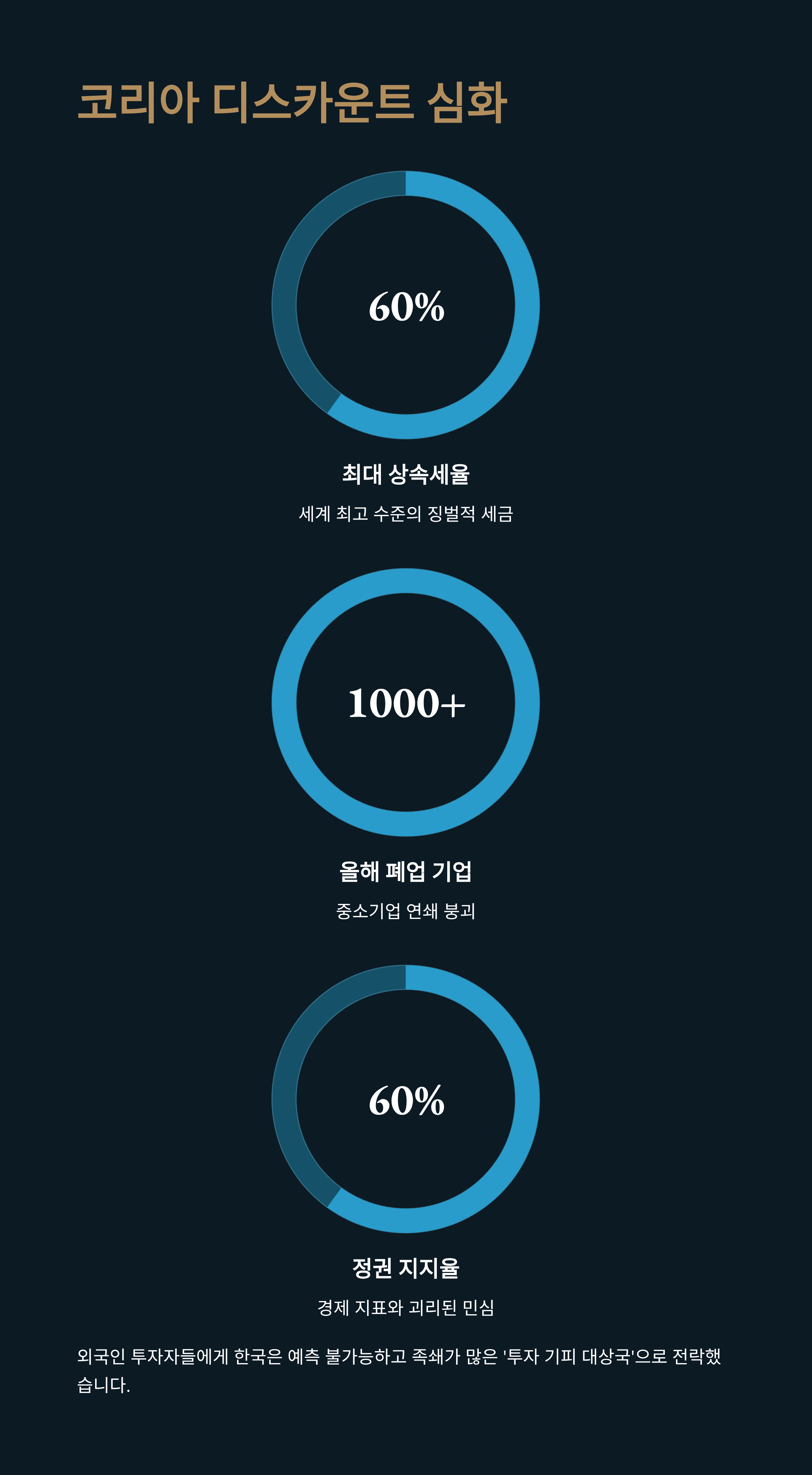 놀랍게도 이러한 경제 현실과 달리 현 정권에 대한 지지율이 60%를 넘는다는 여론조사는 민심과 경제 지표 사이의 깊은 괴리를 보여줍니다. 이는 정책 실패의 효과가 아직 국민들의 피부에 와 닿지 않았거나, 특정 지지층의 강력한 결집 효과 때문일 수 있습니다. 하지만 숫자는 거짓말을 하지 않습니다. 추락하는 FDI, 급증하는 기업 폐업률, 불안정한 환율은 명백한 경고 신호입니다. 정부가 시장 자율성을 존중하고 기업 친화적인 정책으로 선회하지 않는 한, '코스피 5,000'은 허황된 꿈에 그치고 장기 침체의 늪에 빠질 것입니다. 불확실성의 시대, 독자 여러분은 정부 발표보다 시장 데이터에 근거한 냉철한 판단으로 '각자도생'의 지혜를 발휘해야 할 때입니다.
