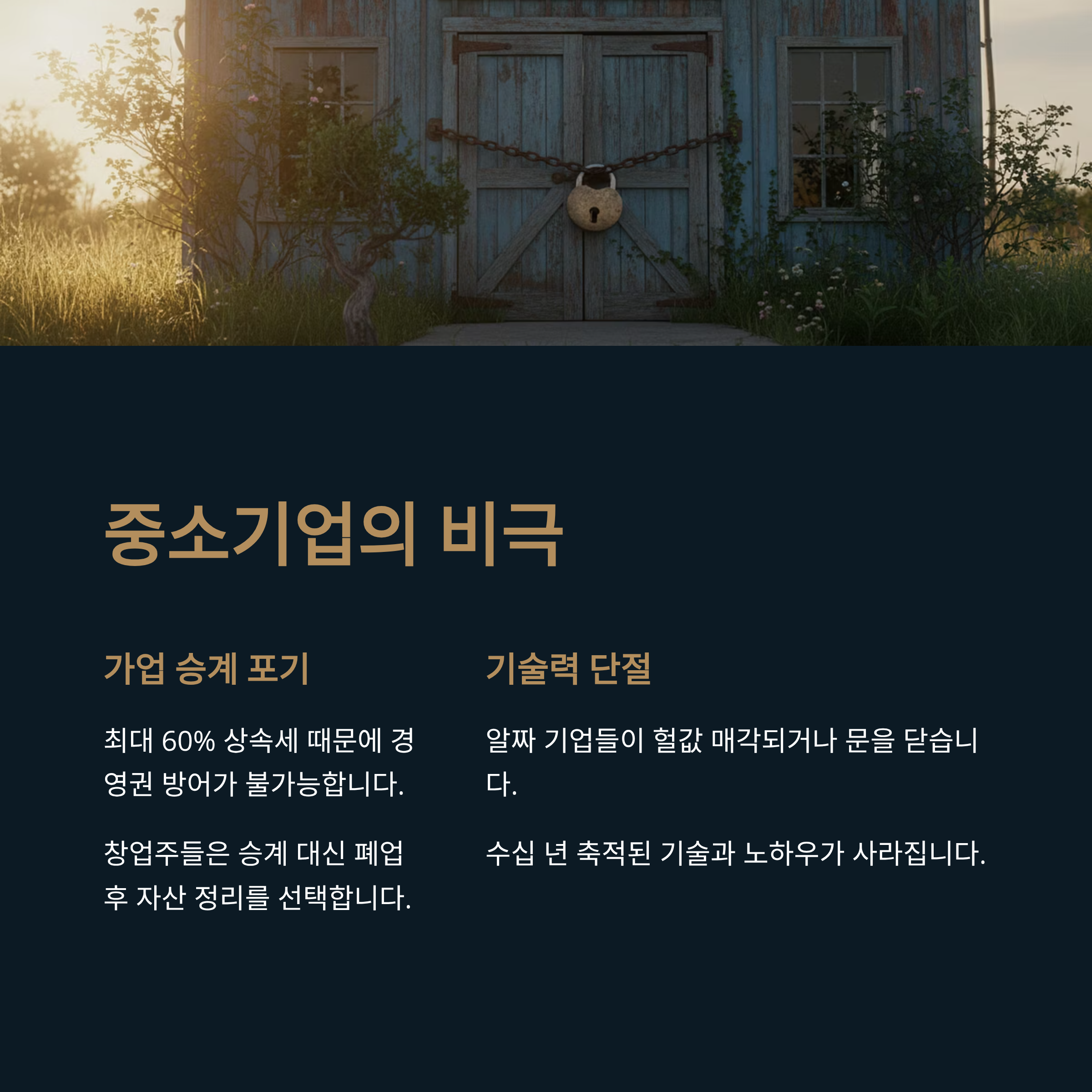 | A3. 가장 큰 원인은 세계 최고 수준의 과도한 상속세 부담입니다. 기업을 물려주기 위해 내야 할 세금이 막대하여 사실상 경영권 유지가 불가능하기 때문입니다. 이로 인해 많은 창업주가 가업 승계 대신 폐업이나 매각을 선택하며, 이는 국내 제조업 기반을 약화시키는 주요 원인이 되고 있습니다. |