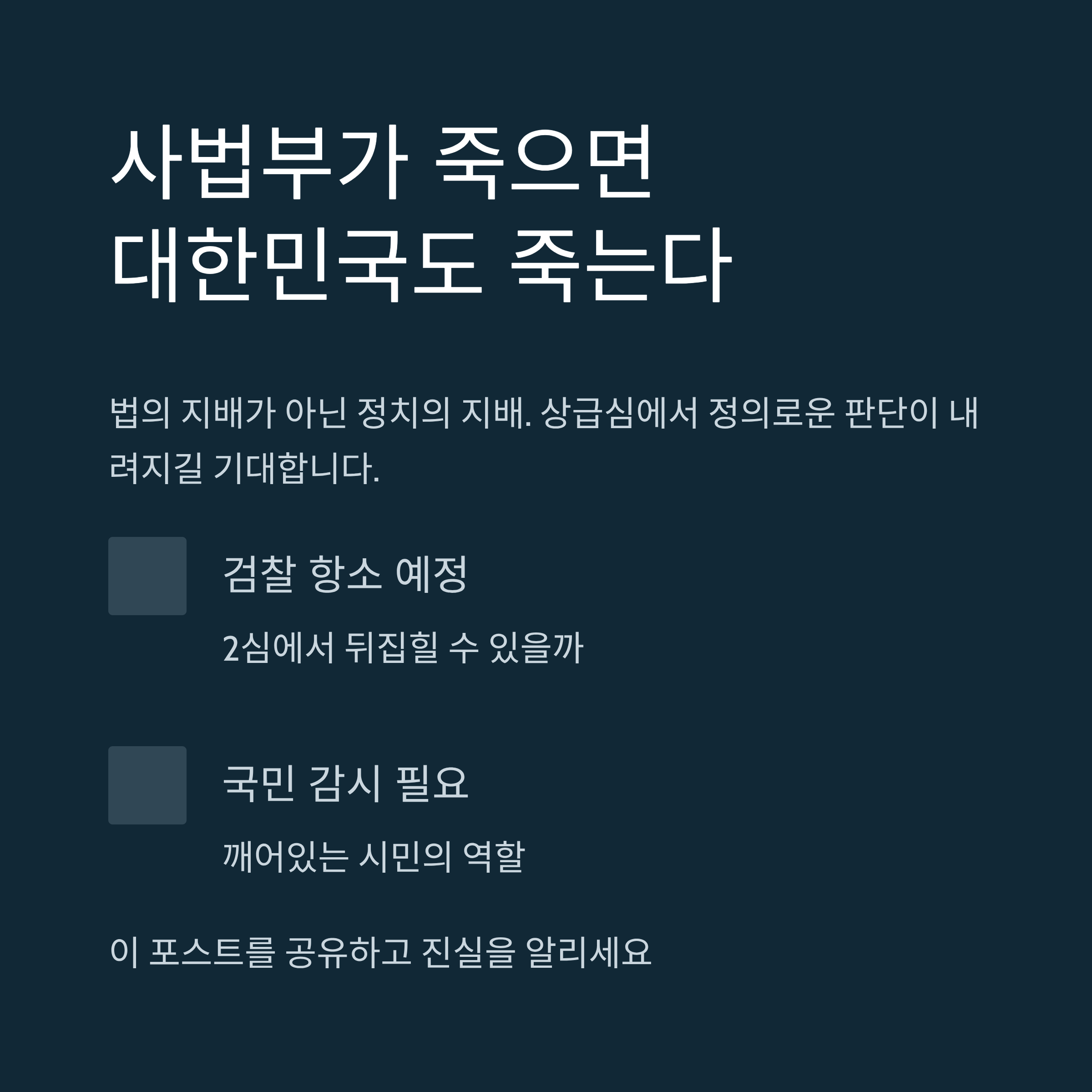 "AI 판사를 도입하라"는 자조 섞인 목소리가 단순한 불평으로 들리지 않는 이유는, 인간 판사들의 양심과 법리가 정치 권력 앞에 무력화되는 모습을 목도하고 있기 때문입니다. 유가족인 이래진 씨의 절규처럼 이번 판결은 "사회적 타당성을 현저히 상실한" 판결입니다. 검찰의 항소가 예상되는 가운데, 상급심에서는 부디 정권의 눈치가 아닌, 오직 헌법과 법률, 그리고 국민의 상식에 부합하는 정의로운 판단이 내려지기를 기대합니다. 사법부가 죽으면 대한민국도 죽습니다. 지금은 깨어있는 국민들의 감시와 비판이 그 어느 때보다 필요한 시점입니다.