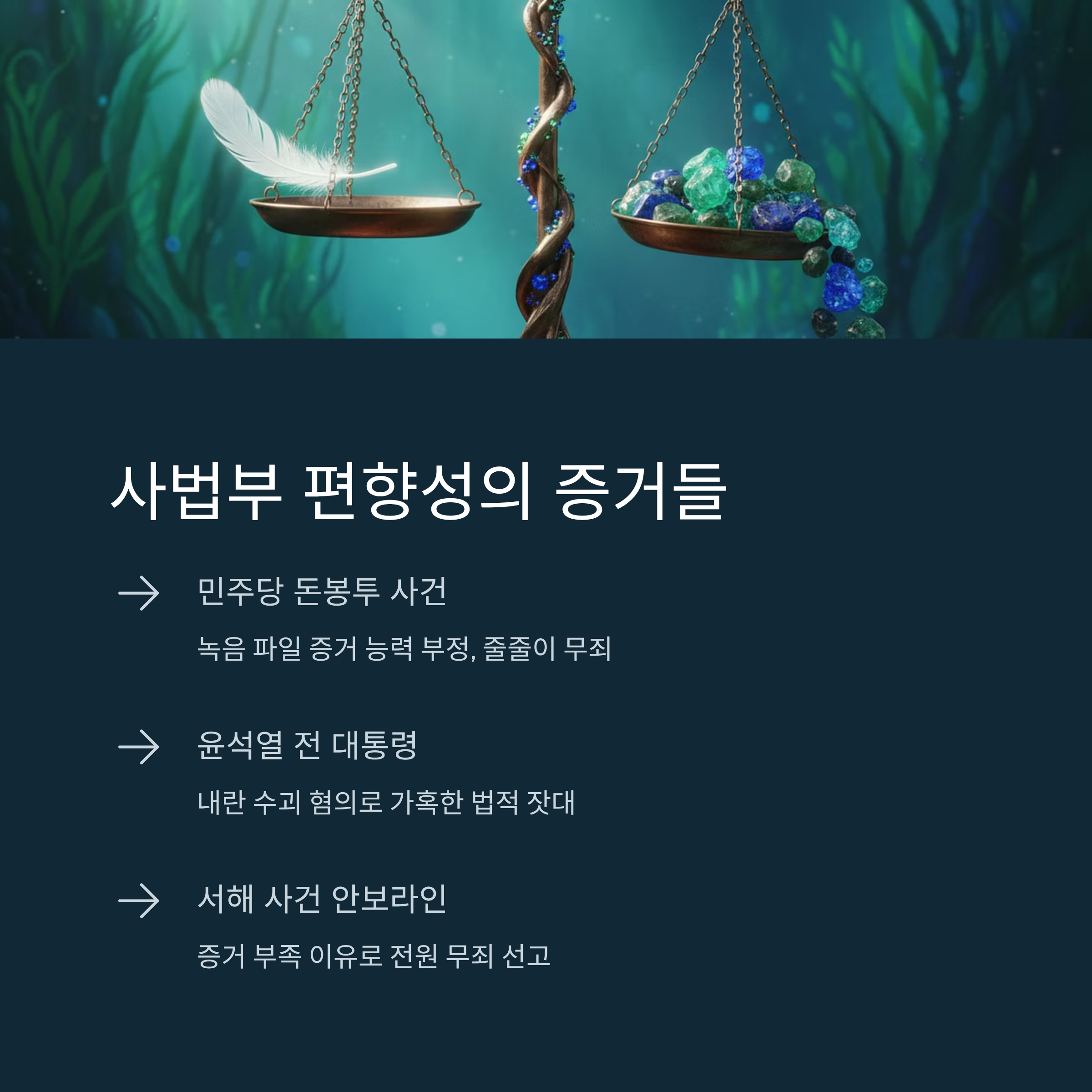 | 이중 잣대 | 민주당 인사(돈봉투 의혹 등) 줄줄이 무죄 vs 윤석열 전 대통령 압박 | "내편 무죄, 네편 유죄"라는 사법 불신 심화. AI 판사 도입 여론 확산. |