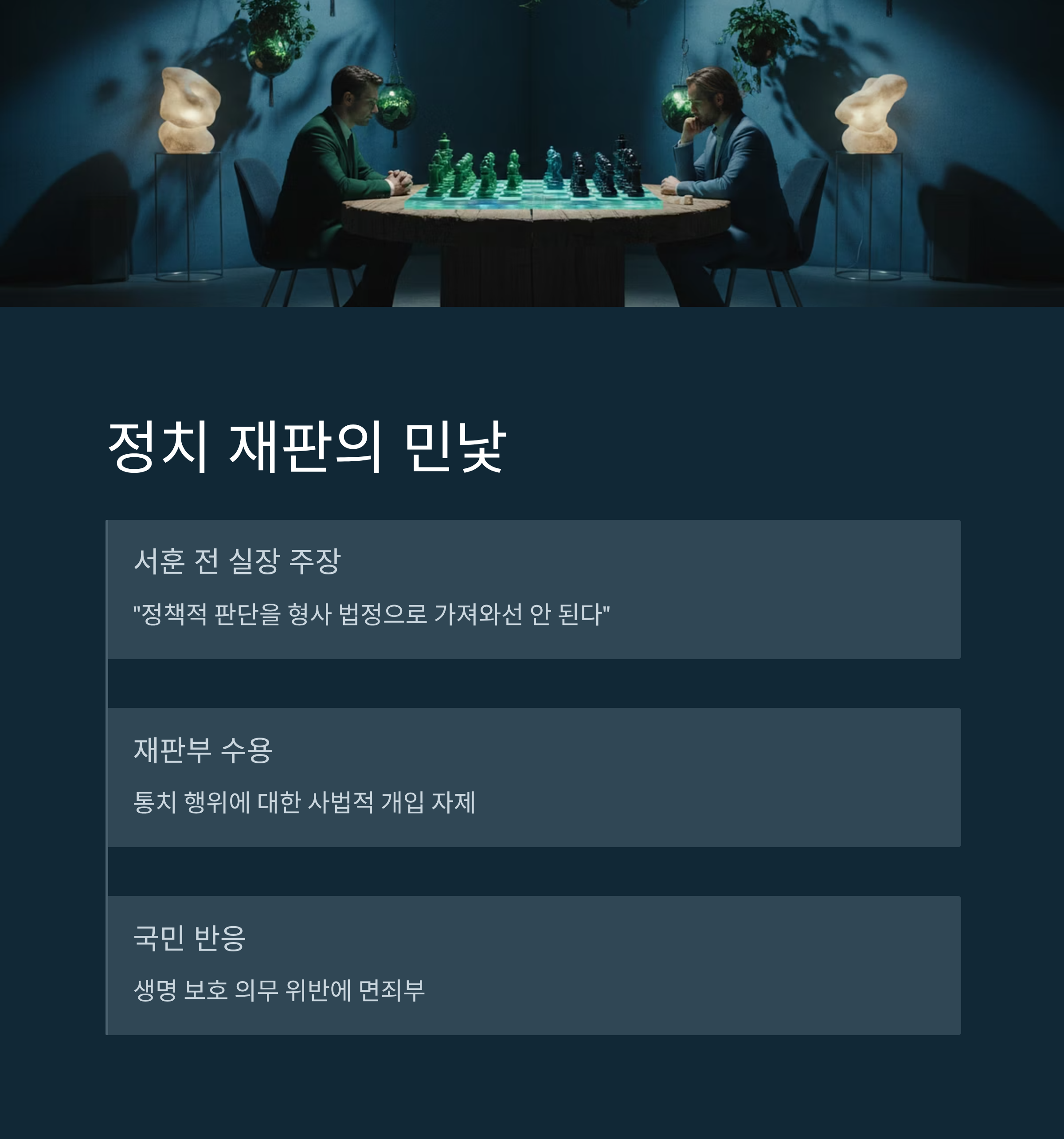| 재판부 성향 | 지귀연 부장판사 (윤석열 전 대통령 내란 혐의 재판 담당) | 정권 교체 후 이재명 정부와 민주당 지지층의 압박을 의식한 '코드 판결' 의혹 제기. |