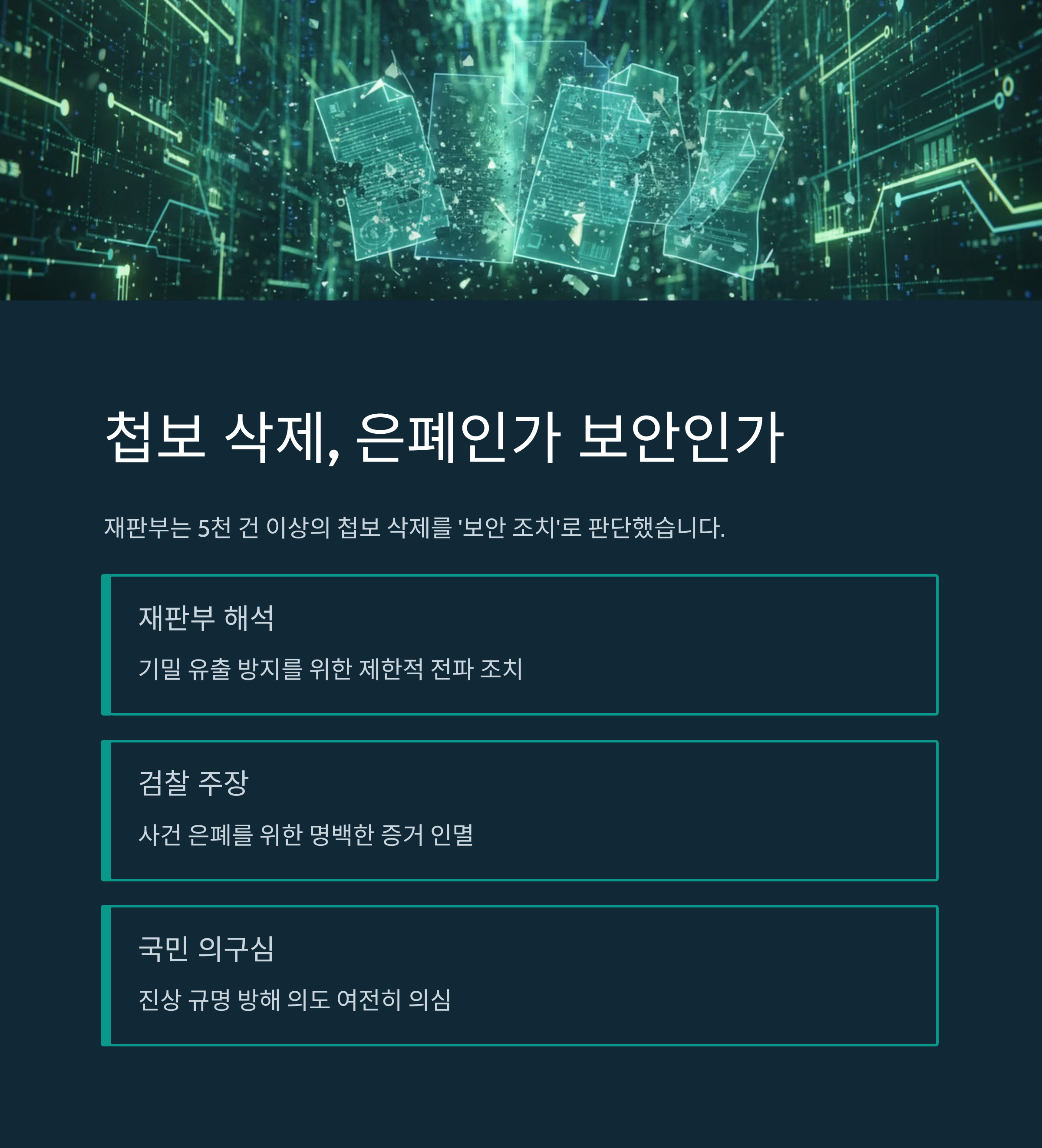 재판부는 검찰이 주장한 '5천 건 이상의 첩보 및 보고서 삭제' 혐의에 대해, 이를 사건 은폐가 아닌 보안 유지를 위한 조치로 해석했습니다. 재판부는 국방부와 국정원의 첩보가 애초에 제한적으로 전파되었어야 했다며, 뒤늦게 불필요한 전파를 막기 위해 삭제한 것으로 볼 여지가 많다고 판시했습니다. 즉, 정보를 없애 실체적 진실을 가리려 했던 것이 아니라, 민감한 정보가 새어 나가는 것을 막기 위한 관리 행위였다는 피고인들의 주장을 그대로 받아들인 것입니다.