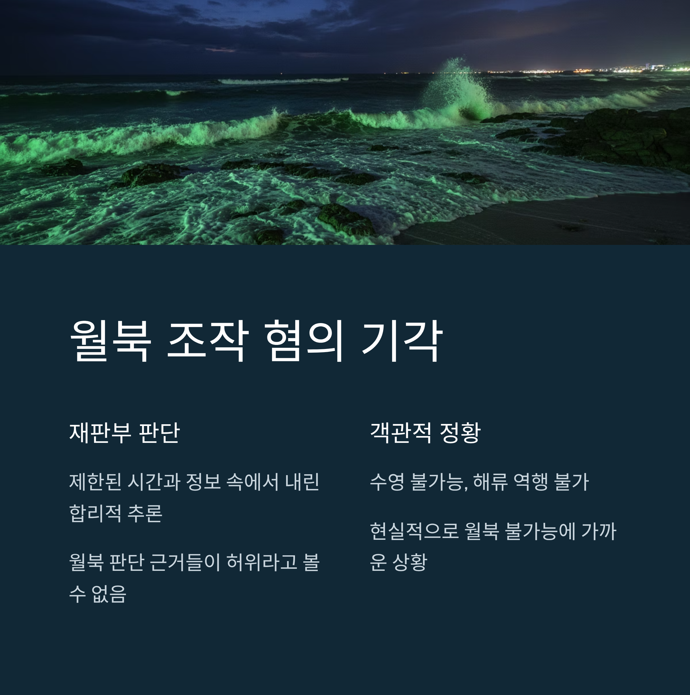 이번 판결에서 가장 논란이 되는 부분은 '월북 조작' 혐의에 대한 무죄 선고입니다. 재판부는 당시 제한된 시간과 정보 속에서 당국이 이대준 씨의 월북 가능성을 배제하지 않고 판단한 것에 합리성이 있다고 보았습니다. 수영을 못하고 해류를 거슬러 올라가야 하는 등 현실적으로 월북이 불가능에 가까웠다는 유가족의 주장과 객관적 정황들은 철저히 배제되었습니다. 재판부는 "월북 판단의 근거들이 모두 허위라고 볼 사정을 발견하기 어렵다"며, 당시 정부의 판단이 추상적이거나 막연한 동기에 의한 것이 아니라고 설시했습니다.