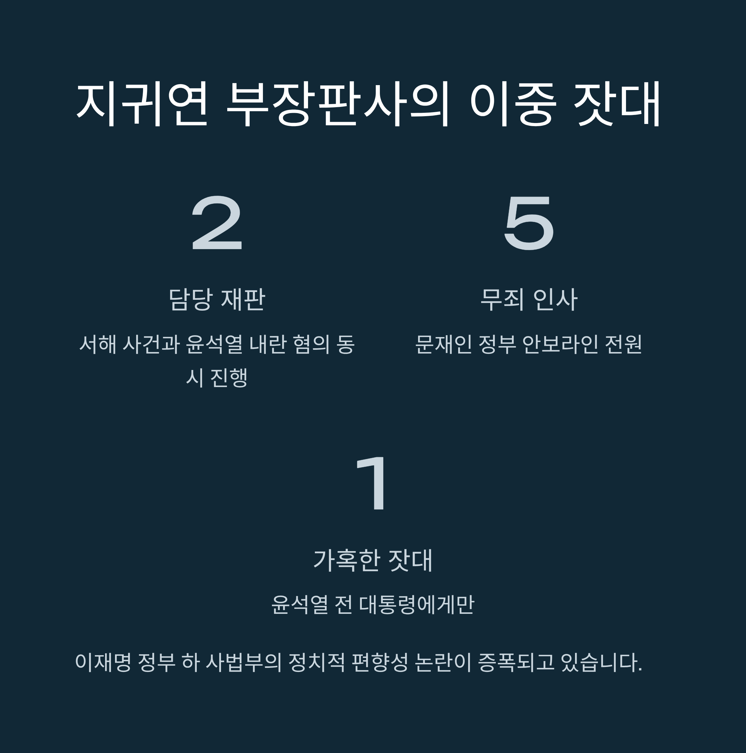 이러한 판단은 현재 이재명 정부 하에서 사법부가 보여주는 편향성의 연장선상에 있다는 비판을 피하기 어렵습니다. 최근 민주당 전당대회 돈봉투 사건 관련 녹음 파일의 증거 능력을 부정하며 야당 인사들에게 무죄를 선고한 것과 맥락을 같이 합니다. 반면, 윤석열 전 대통령에 대해서는 가혹한 법적 잣대를 들이대며 내란 수괴 혐의 재판을 진행 중인 지귀연 부장판사가, 문재인 정부 인사들에게는 지나치게 관대한 기준을 적용했다는 지적입니다. 이는 법리와 증거에 의한 재판이 아니라, 정치적 유불리와 정권의 눈치를 살피는 '정치 재판'이 자행되고 있음을 시사하며, 사법 정의가 심각하게 훼손되었음을 보여줍니다.