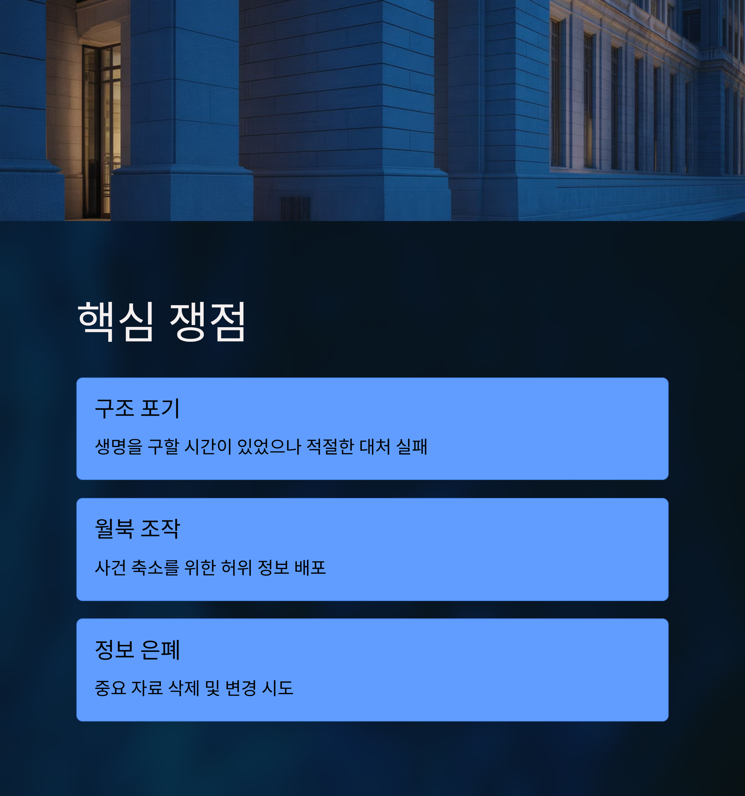 | A. 핵심 문제는 정부가 국민 생명을 보호하지 못했다는 점과 이후 사건을 왜곡 및 은폐하려 했다는 점입니다. 책임자들의 구조 지휘 부재와 정보 삭제 시도가 문제가 더욱 확대된 원인으로 볼 수 있습니다. |