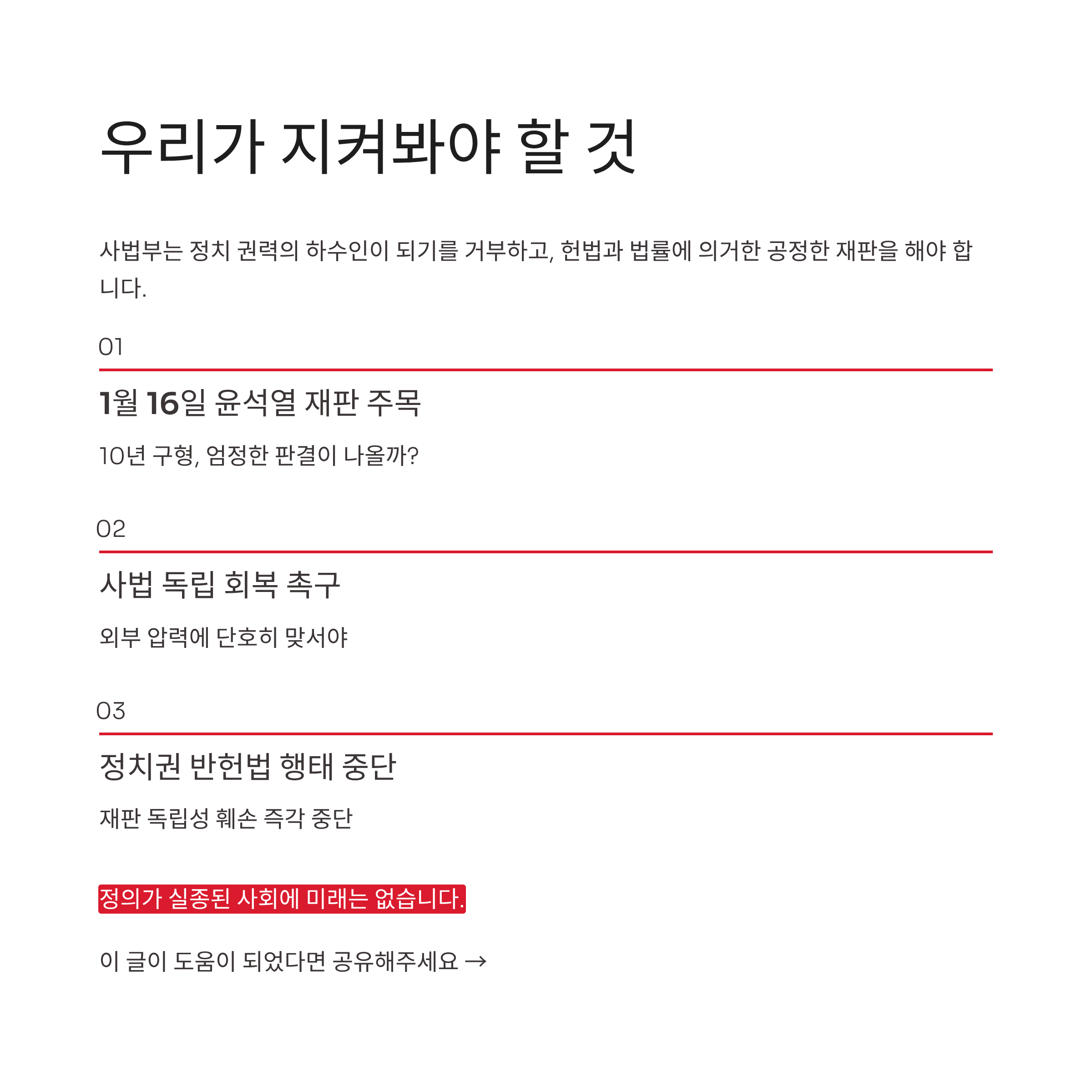 사법부가 정치 권력의 하수인이 되기를 거부하고, 오직 헌법과 법률에 의거하여 공정한 재판을 할 때 비로소 무너진 신뢰를 회복할 수 있습니다. 지금이라도 사법부는 외부의 부당한 압력에 단호히 맞서야 하며, 정치권 역시 재판의 독립성을 훼손하는 반헌법적 행태를 즉각 중단해야 합니다. 정의가 실종된 사회에 미래는 없습니다.