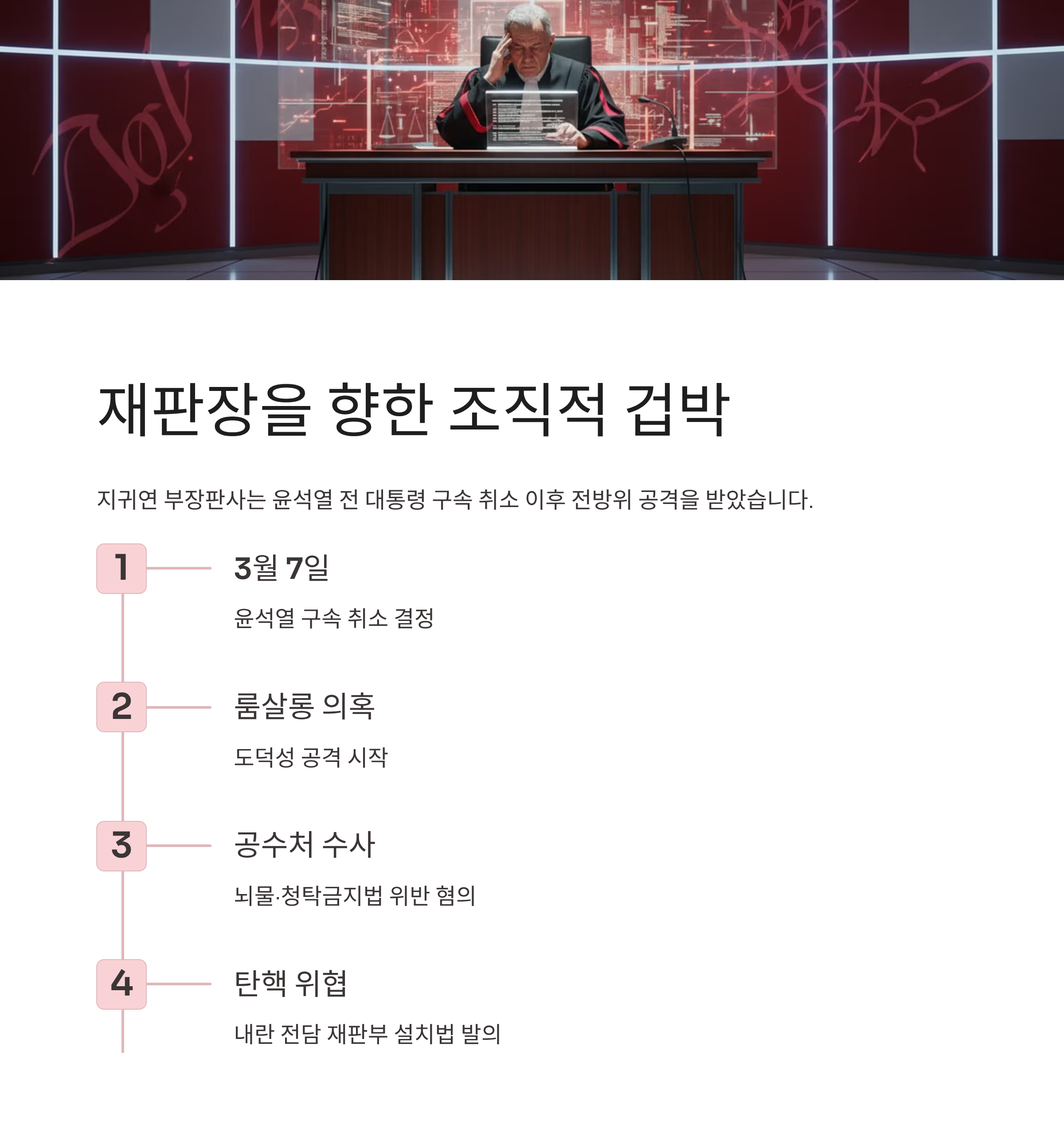 | Q2. 지귀연 부장판사가 받고 있는 구체적인 압박과 혐의는 무엇인가요? |