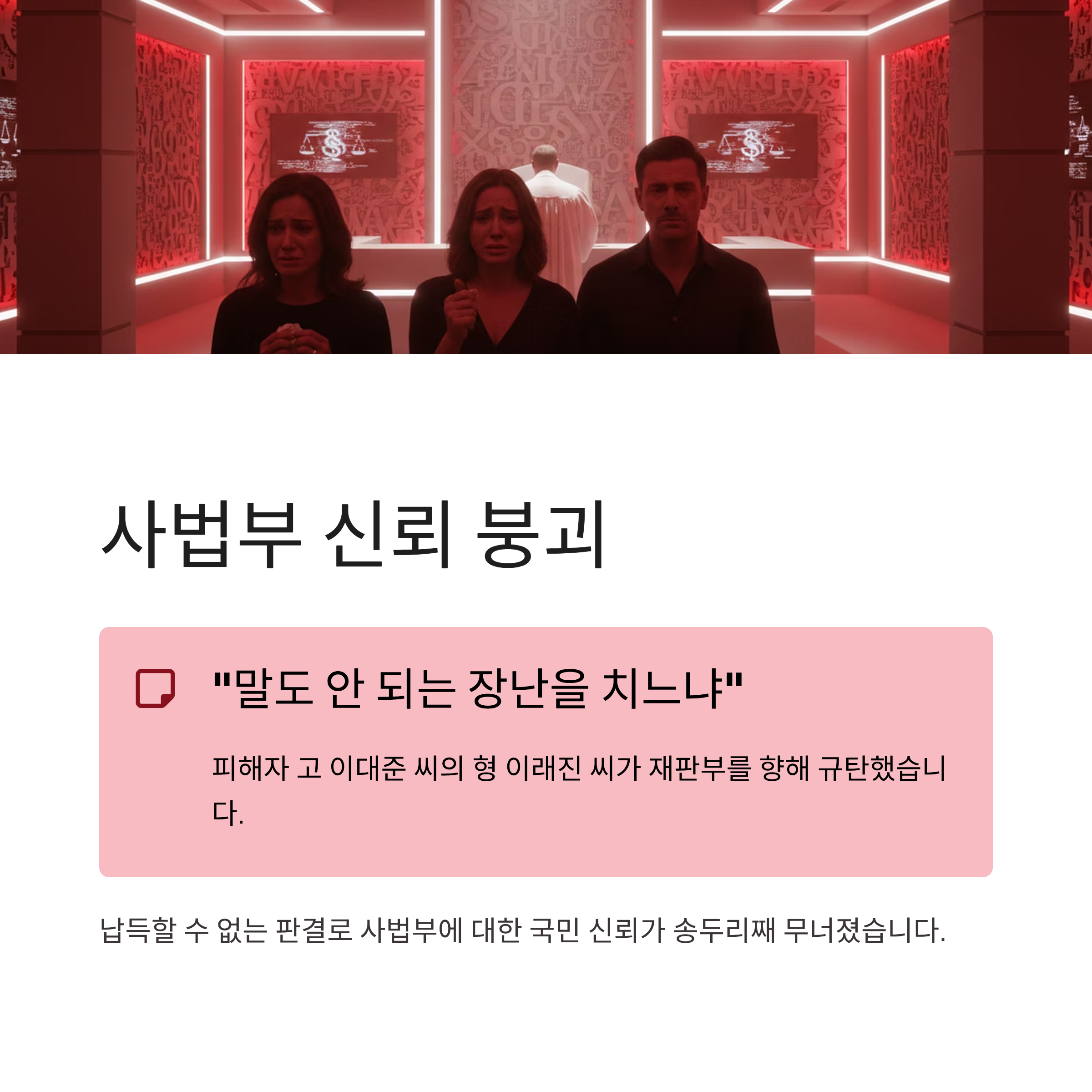 법치주의 훼손: 피해자 유가족은 "재판이 장난이냐"며 오열했고, 법조계에서는 대한민국이 법치가 아닌 '인민재판의 시대'로 회귀했다는 자조 섞인 비판이 나오고 있습니다.