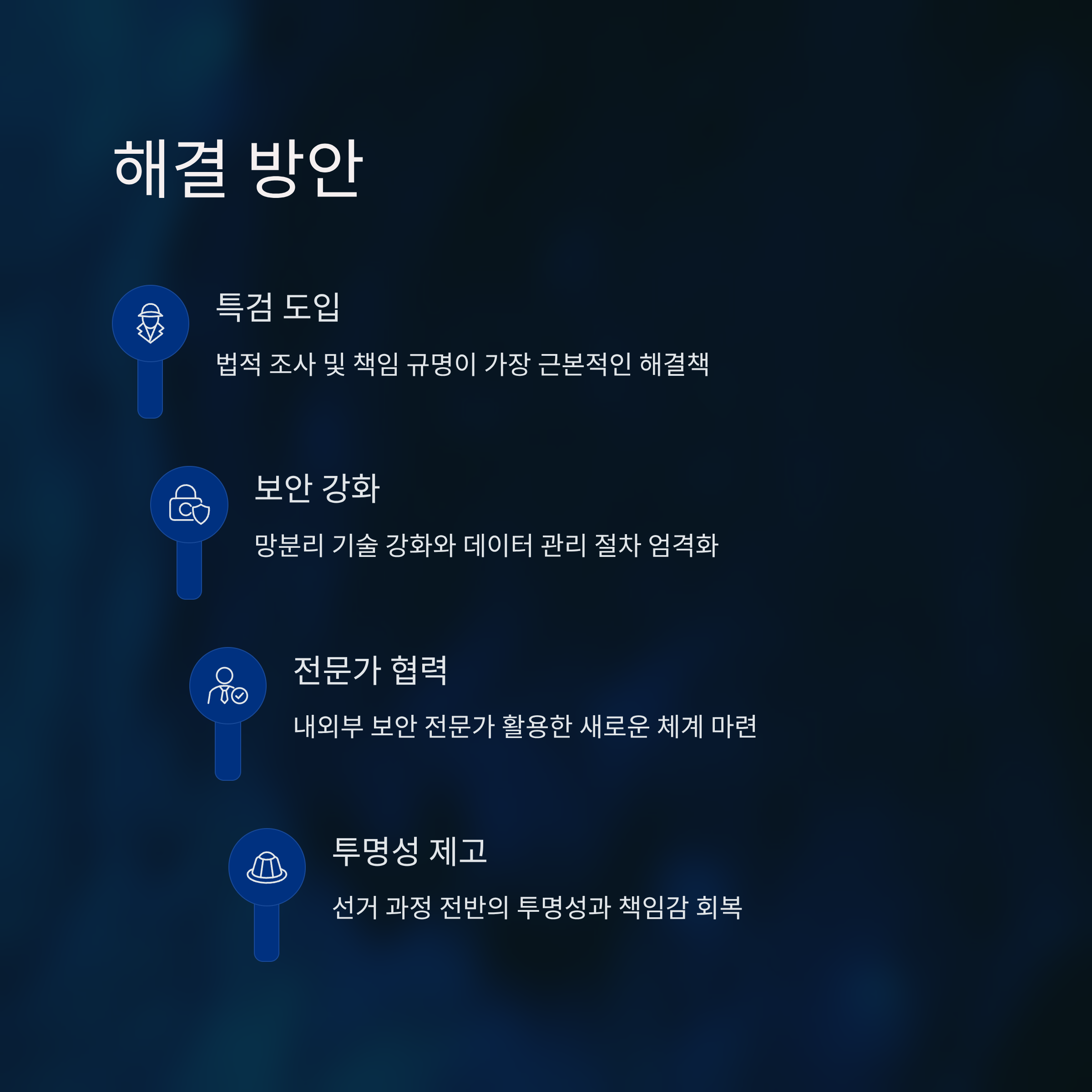 또한 선거 과정에서 보안 강화 및 투명성 제고를 위한 기술적 개선도 함께 이루어져야 합니다. 선거 관리 시스템의 망분리를 더욱 강화하고, 사전투표를 포함한 주요 데이터의 보관 및 관리 절차를 엄격히 점검해야 할 것입니다. 그와 동시에, 선관위 내외부의 보안 전문가를 활용하여 새로운 보안 체계를 마련하는 것이 중요합니다.