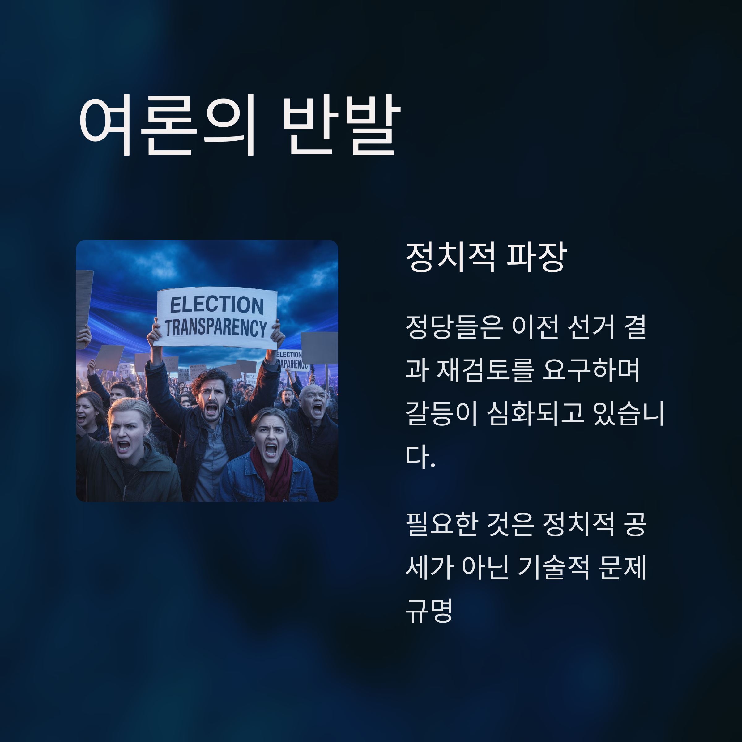 여론과 정치권은 이번 사태에 크게 반발하며 선거 투명성에 심각한 의문을 제기하고 있습니다. 일부 정당은 이번 문제를 빌미 삼아 이전 선거 결과까지 재검토하자는 목소리를 높이고 있습니다. 이는 문제 해결보다는 정치적 대립과 갈등을 심화시킬 가능성이 높습니다.