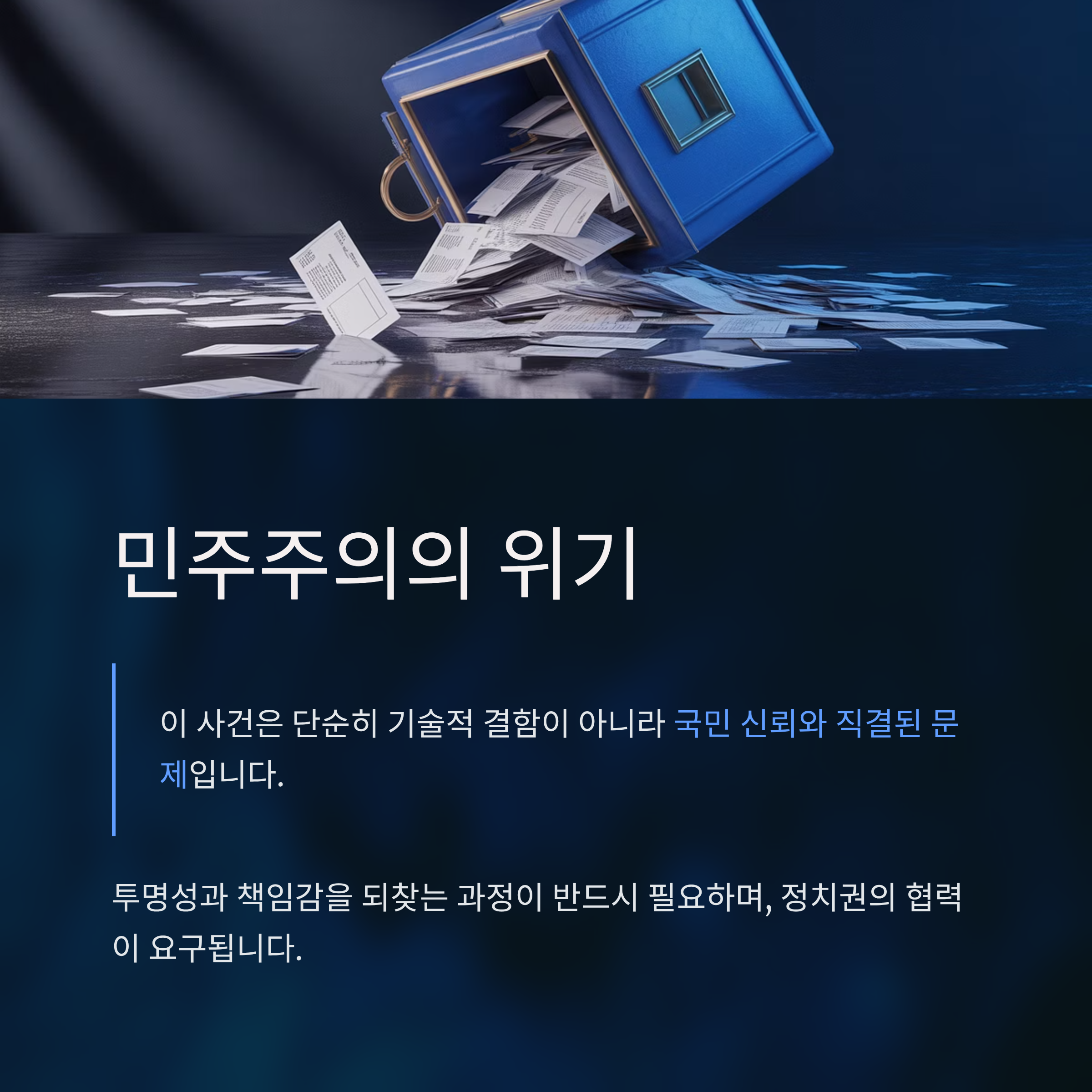 이 사건은 단순히 기술적 결함이 아니라 국민 신뢰와 직결된 문제라는 점에서, 투명성과 책임감을 되찾는 과정이 반드시 필요합니다. 더불어 정치권 역시 문제를 정치적 갈등의 도구로 사용하는 것을 지양하고, 구체적인 해결책을 제시하며 협력해야 합니다.
