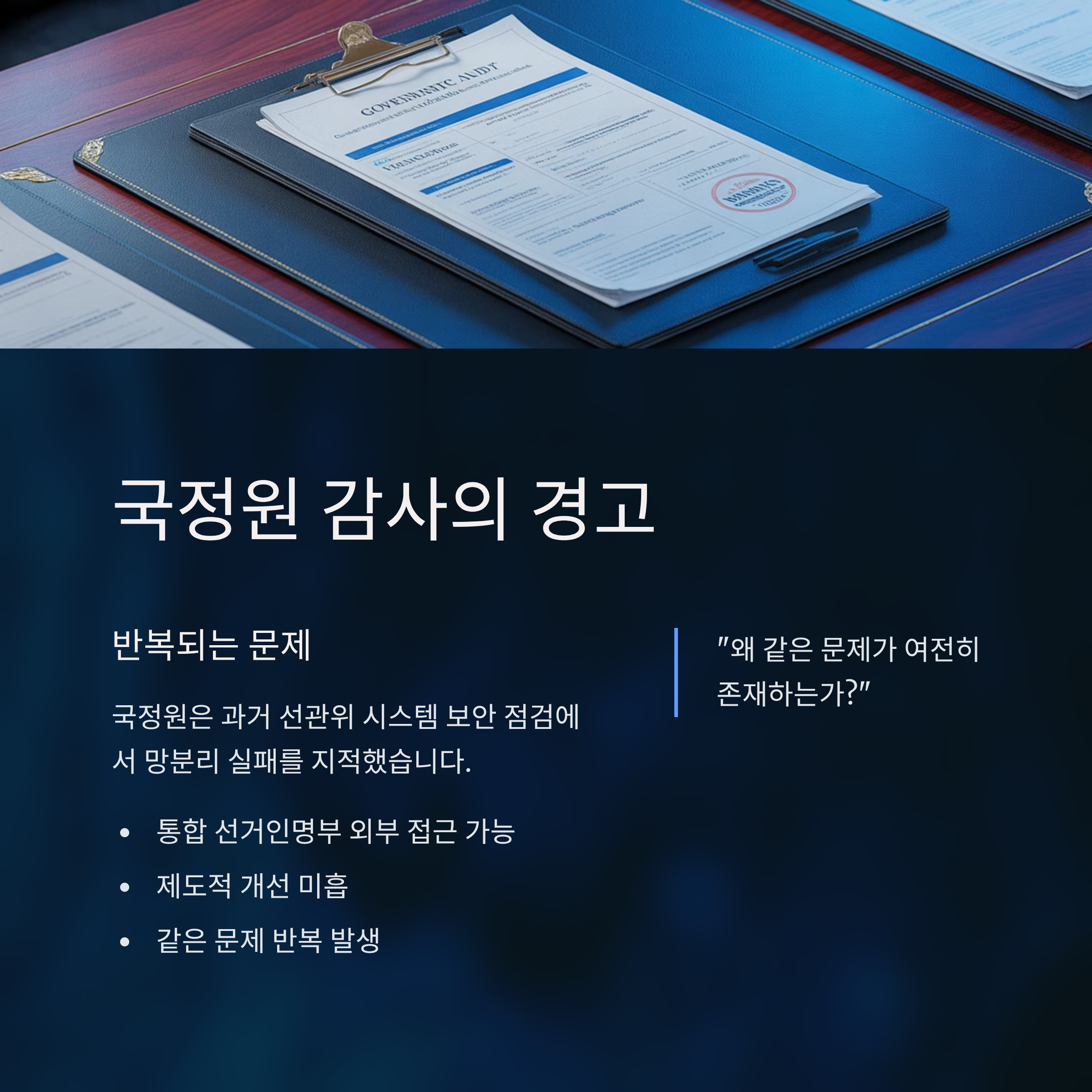 3. 국정원의 과거 감사 자료에서도 선거망 보안이 여전히 취약한 점이 반복적으로 나타났습니다.