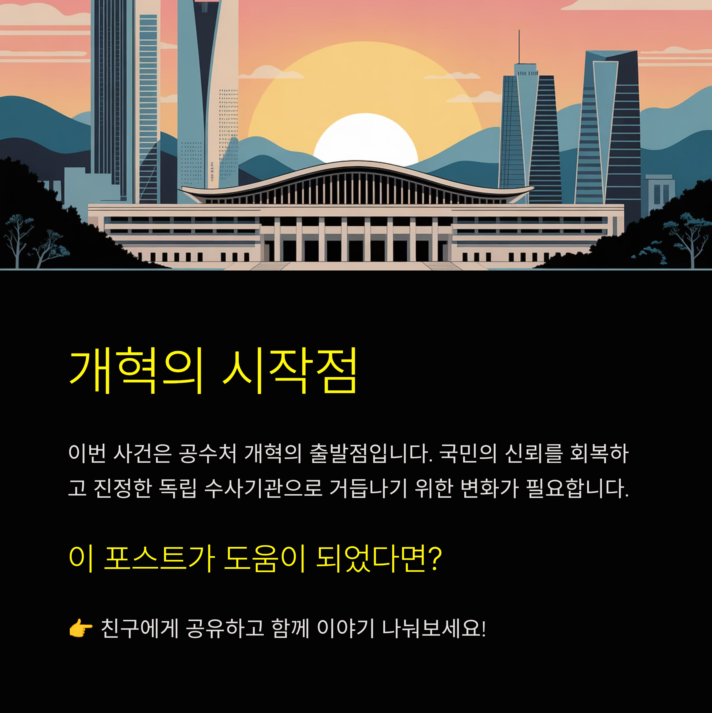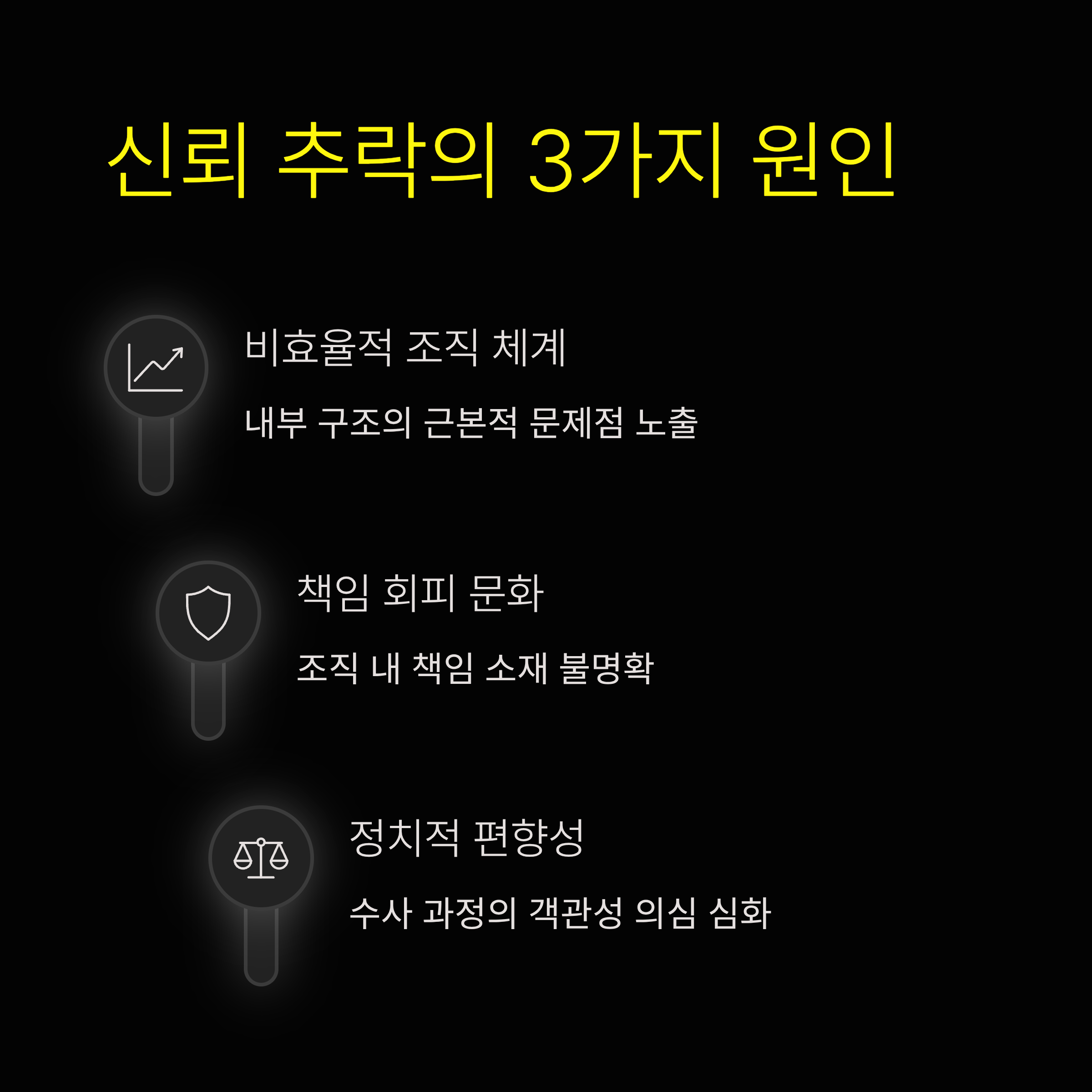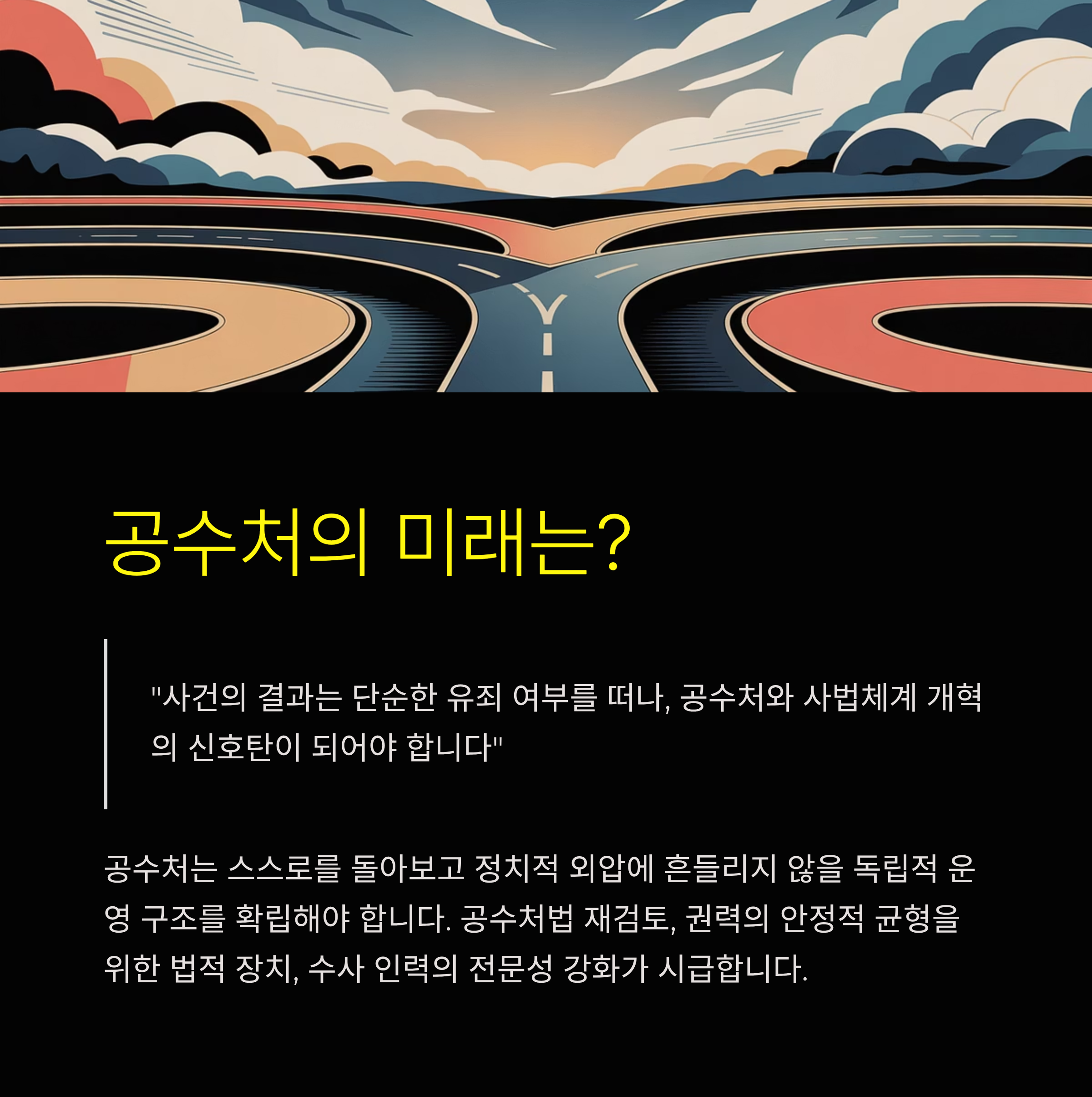 공수처는 국민의 기대와 함께 설립되었지만, 설립 취지와는 반대로, 그동안 지속적으로 투명성과 객관성을 의심받아왔습니다. 이번 사건으로 내부의 비효율적 조직 체계, 책임 회피 문화, 그리고 수사 과정의 정치적 편향성 논란이 더욱 심화되었습니다. 국민적 신뢰를 회복하기 위해서는 공수처 개혁에 대한 구체적 로드맵이 필요하며, 특히 사건 처리 과정의 공개와 외부 감찰 기구의 설치 등 구체적 개혁 방안이 마련돼야 합니다.