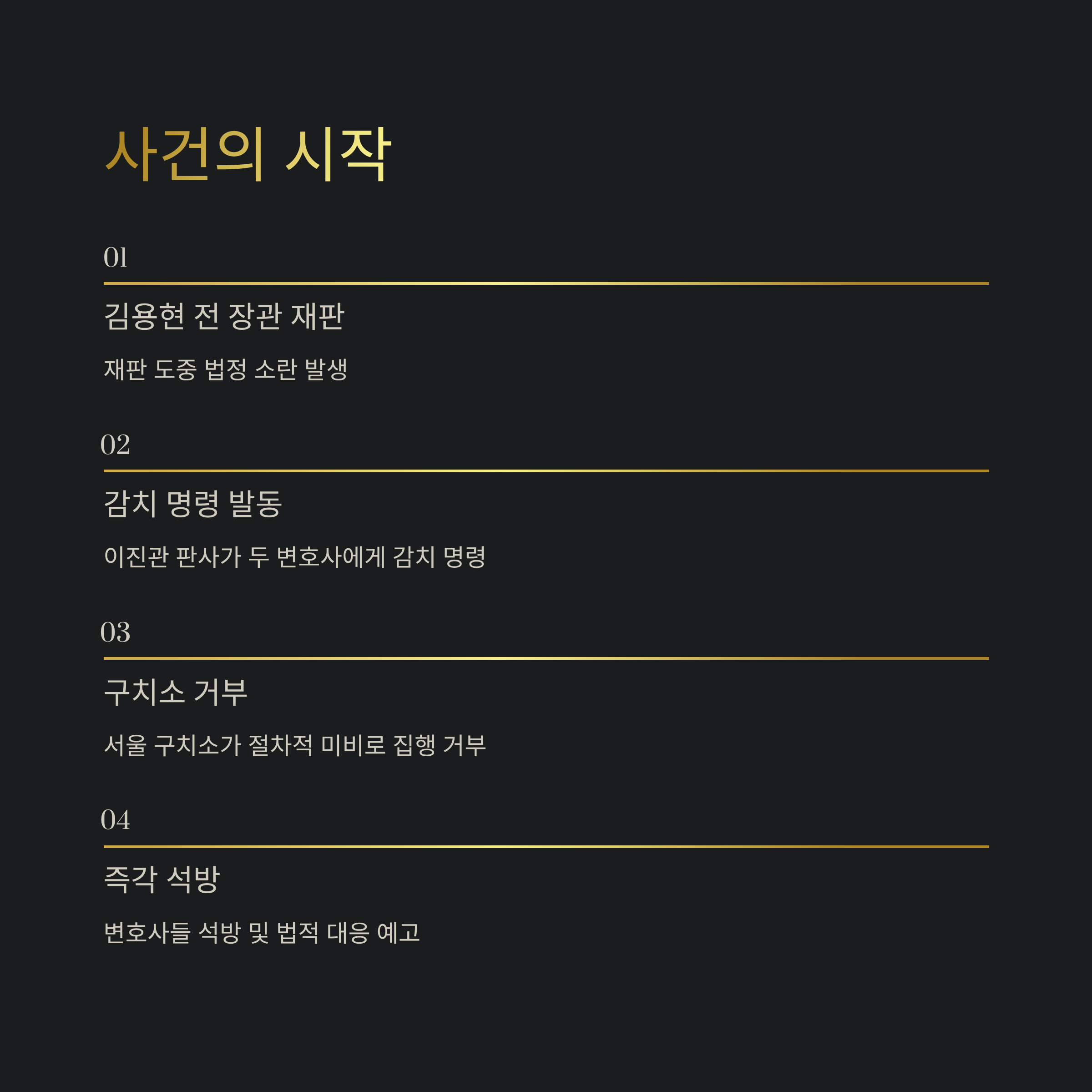 1. 김용현 전 장관의 재판 도중, 이진관 판사가 이하상·권우현 변호사들에게 감치 명령을 강행.