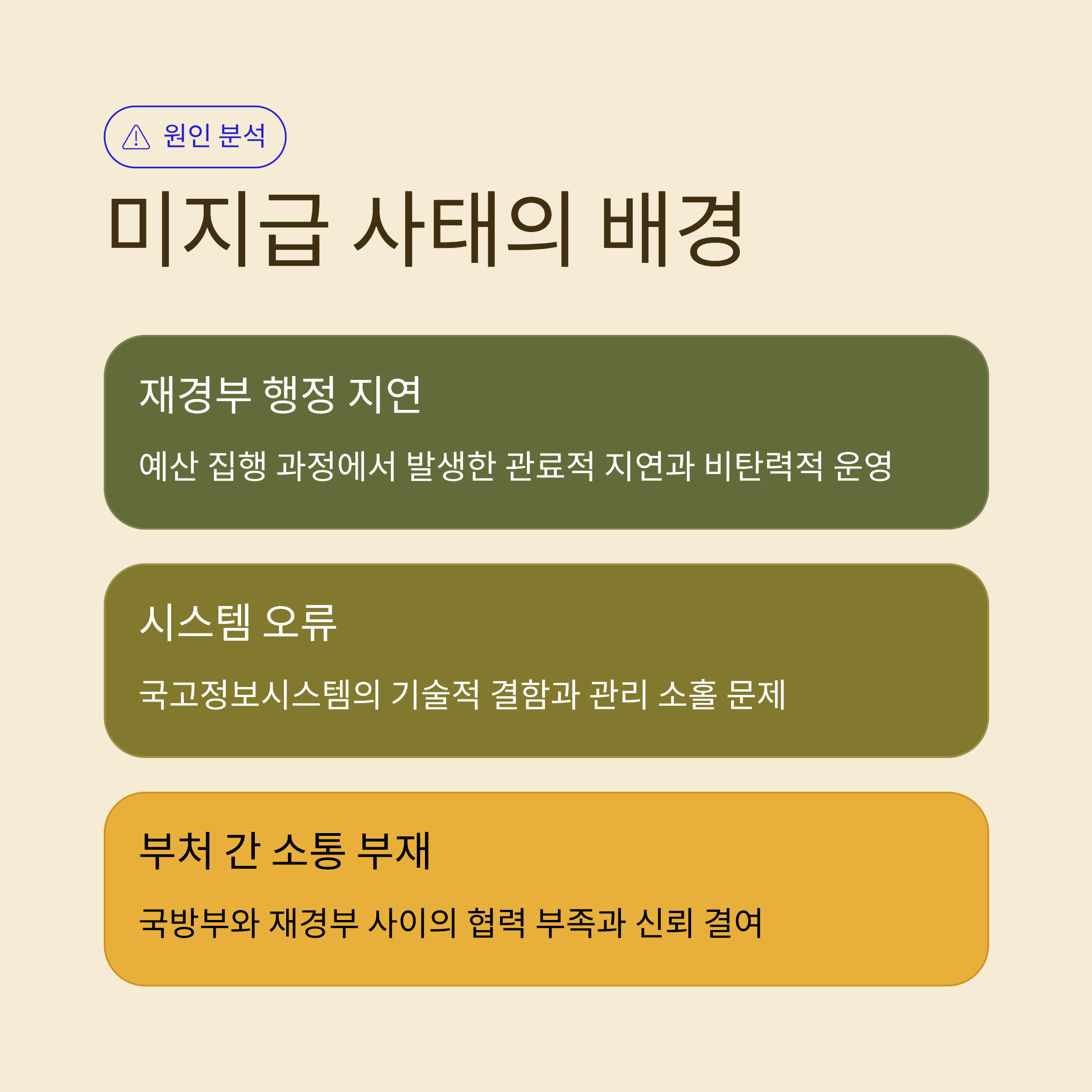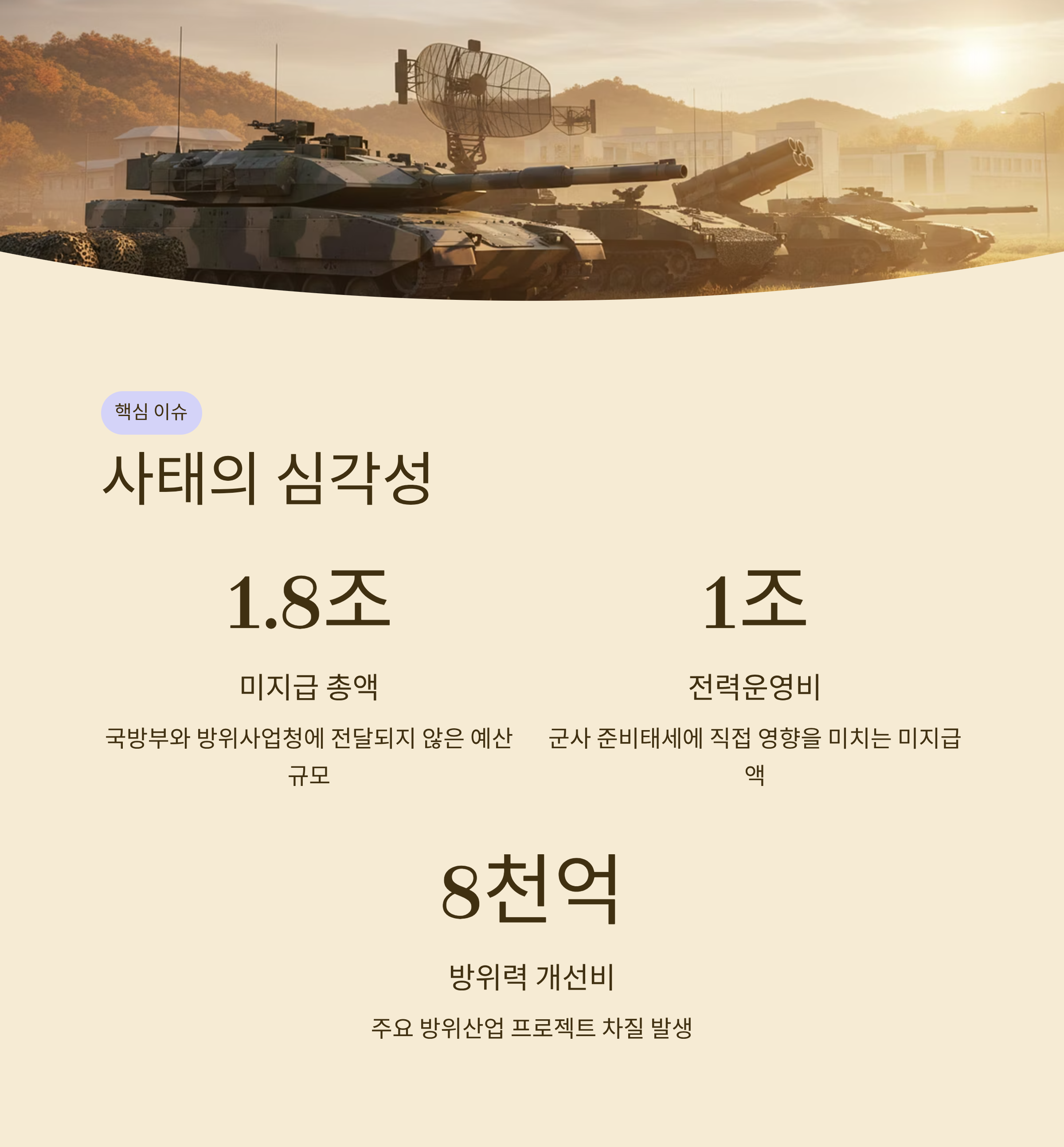 - 1.8조 원의 국방 예산 미지급은 재경부 행정 지연과 시스템 오류가 원인으로 지목되었습니다.