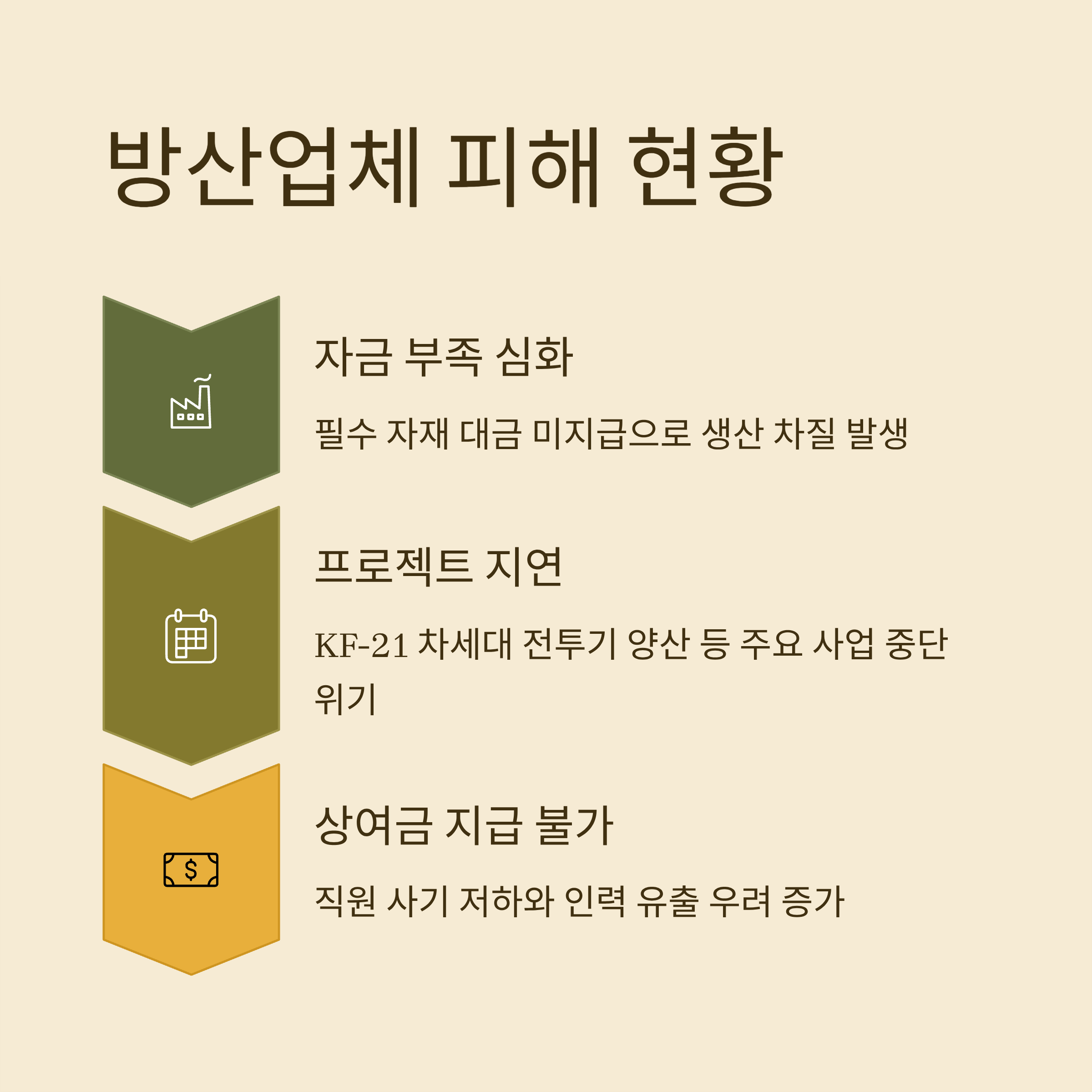 - 방산업체의 계획 차질 및 상여금 등 지급 문제가 현실화되었습니다.