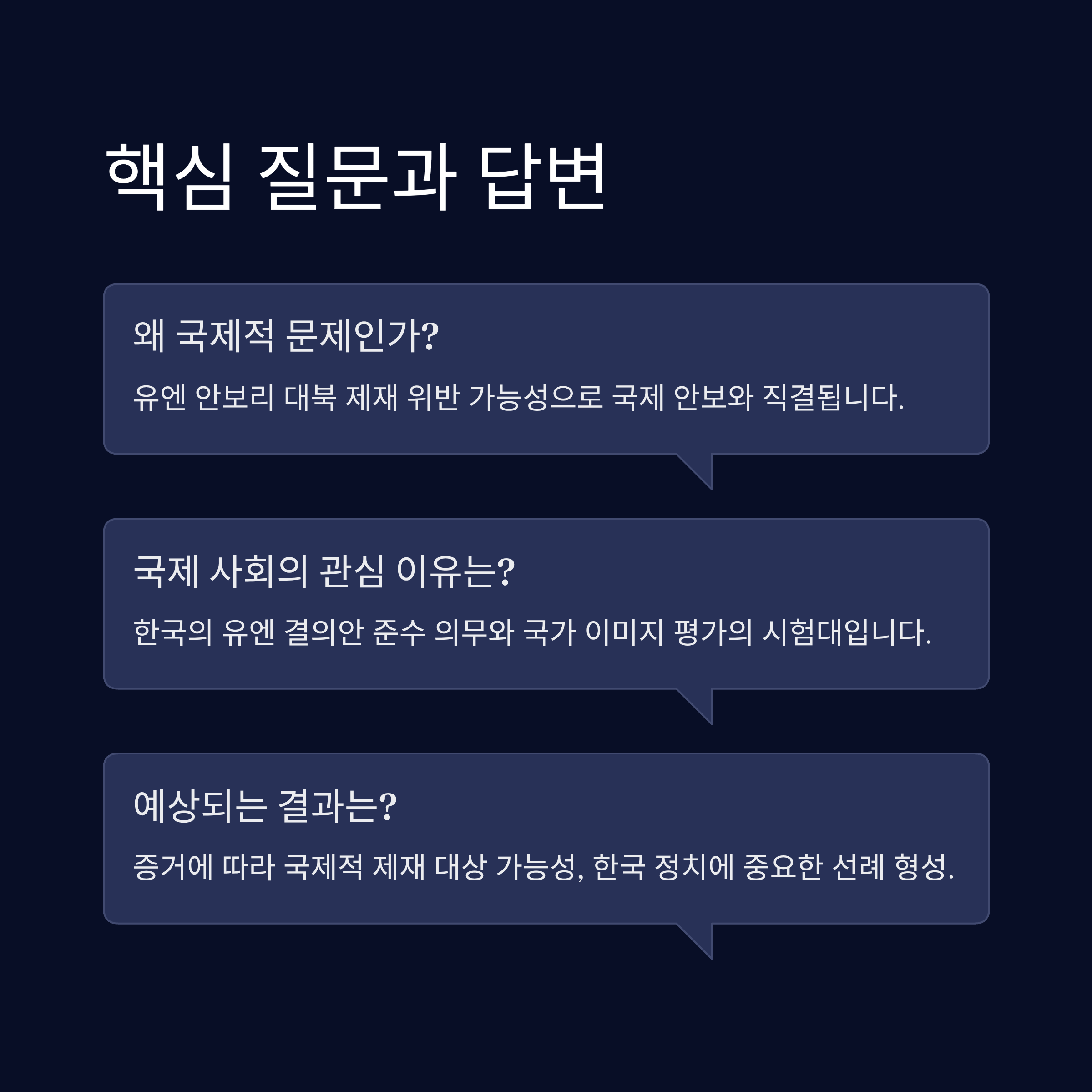 | A. 이 사건은 유엔 안보리 대북 제재 위반 가능성 때문에 국제적 영향을 미칠 수 있습니다. 특히 ICC와 같은 독립적 기구의 조사 대상이 될 가능성이 있어 단순 국내 정치 사건을 넘어섭니다. |