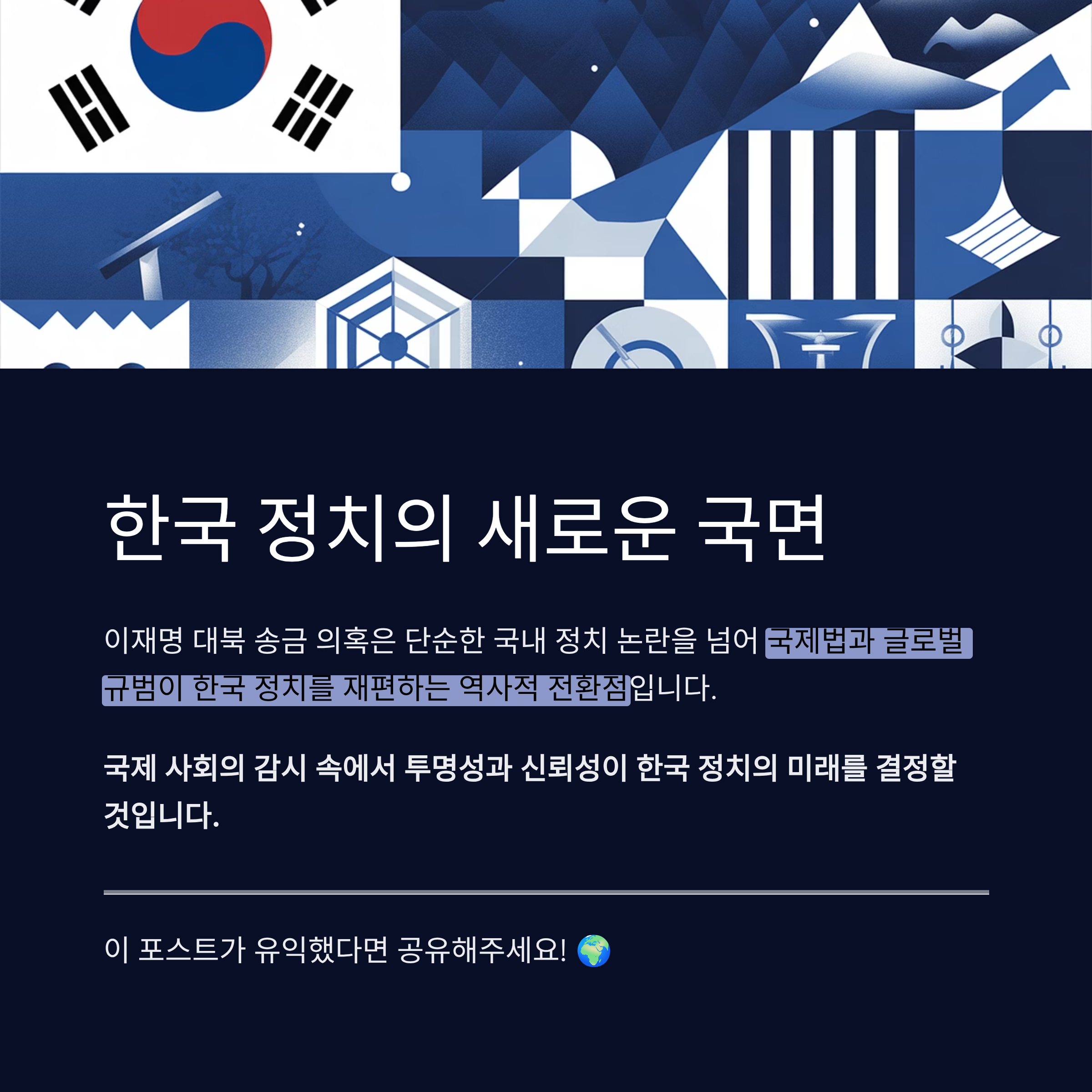 이재명 대북 송금 의혹과 이에 따른 국제 고발은 한국의 정치 및 법률 체계뿐 아니라 글로벌 규범과의 상호작용을 시험하는 중요한 사례입니다. 국제 형사 재판소와 유엔 안보리를 통한 독립적인 조사는 한국 정부에 대북 정책 및 국내 정치적 결정을 국제법적 맥락에서 재평가할 필요성을 제시했습니다. 이번 사건은 한국 내부에서의 정당 간 경쟁 이상으로, 국제 사회의 감시와 영향력이 확대되는 새로운 정치 환경을 형성하고 있습니다. 향후 유엔 및 국제 형사 재판소의 진행 상황에 따라 한국 정치의 투명성과 신뢰성이 국제 평판에 어떻게 영향을 미치는지 주목해야 할 시점입니다.