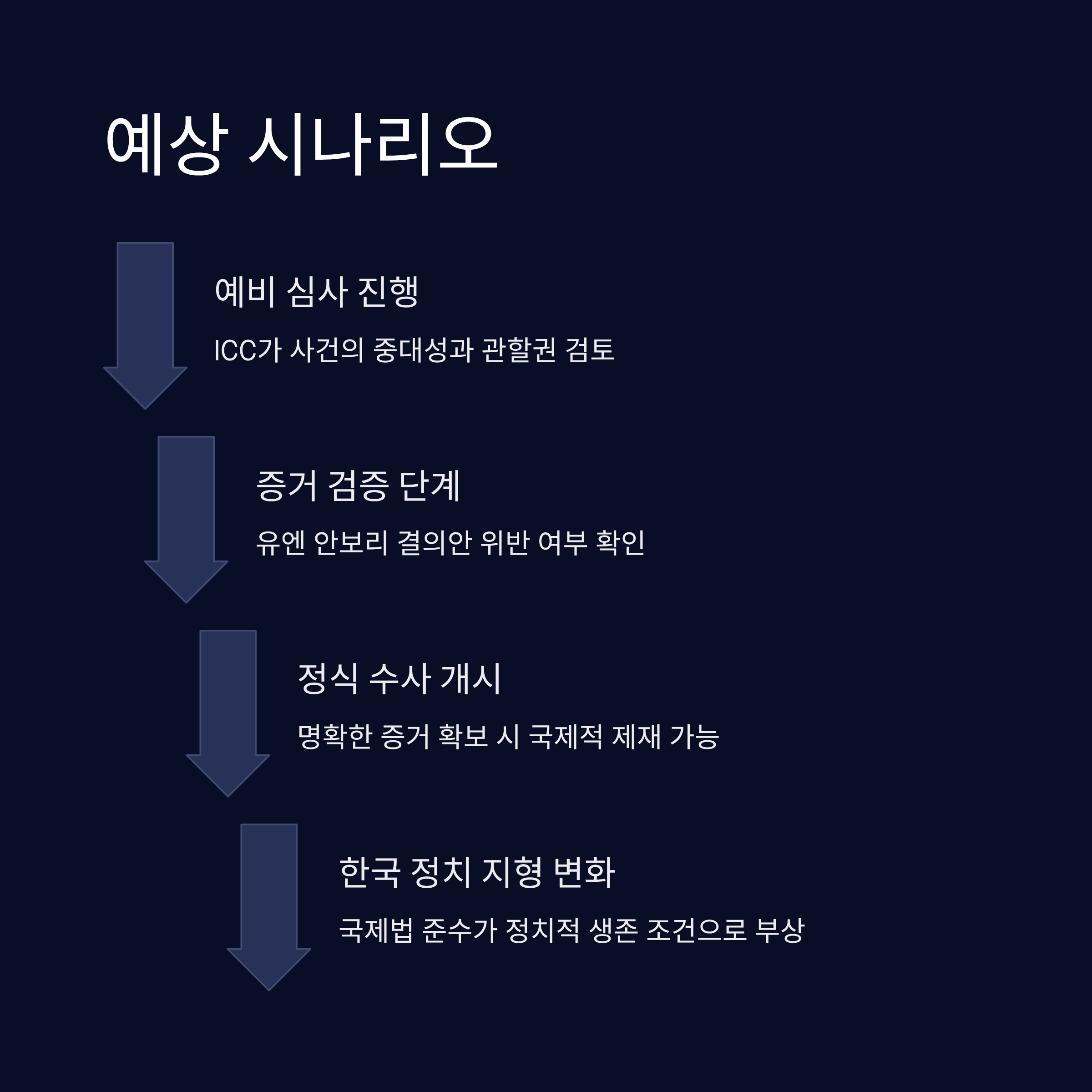 | A. 유엔 및 ICC의 판단은 시간이 걸릴 수 있지만, 명확한 증거 제시에 따라 한국과 관련 인물이 국제적 제재 대상이 될 가능성도 존재합니다. 조사는 한국 내부와 국제 질서에 중요한 선례를 남길 것입니다. |