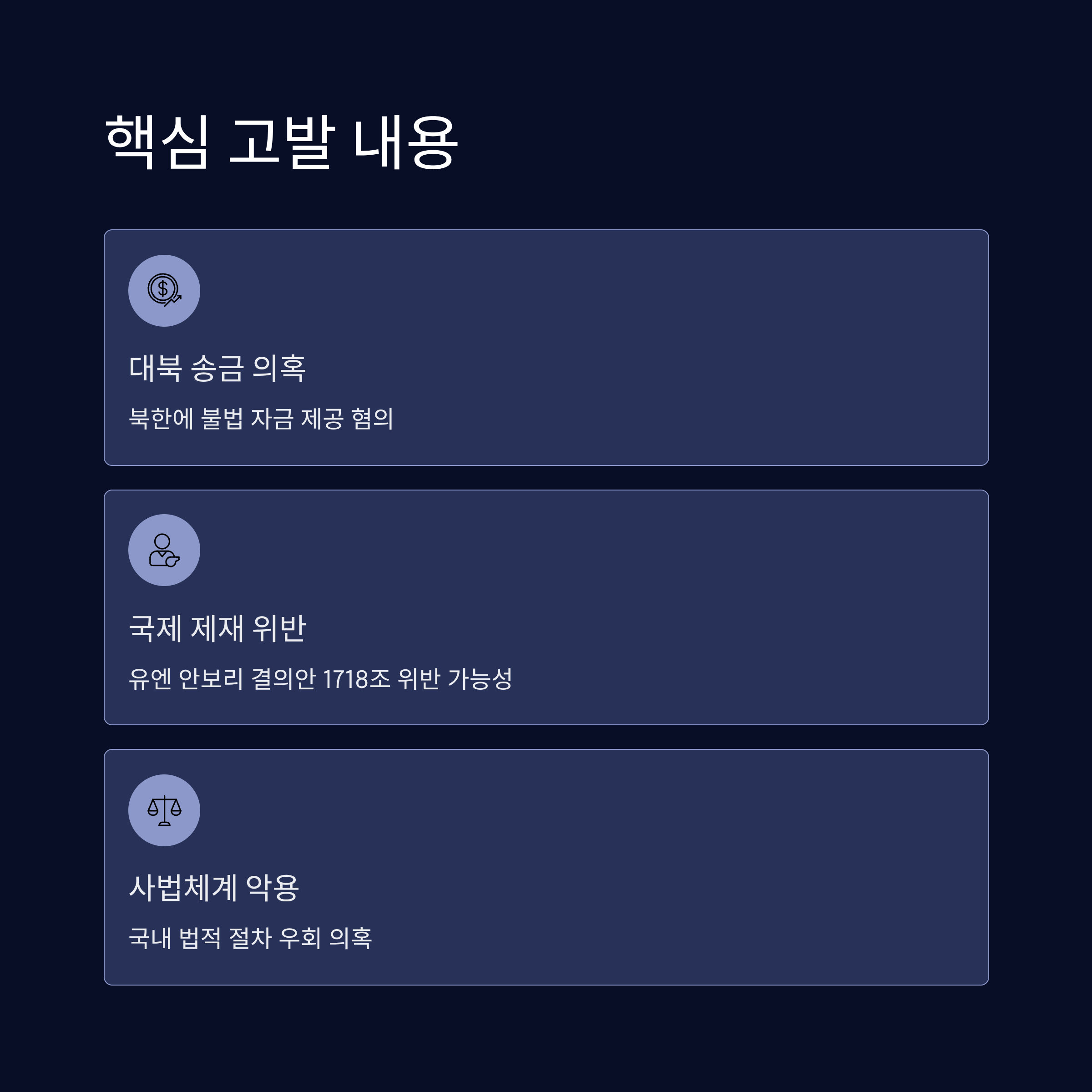 2. 고발 내용: 북한 대북 송금, 국제 제재 위반, 사법체계 악용 의혹 등.