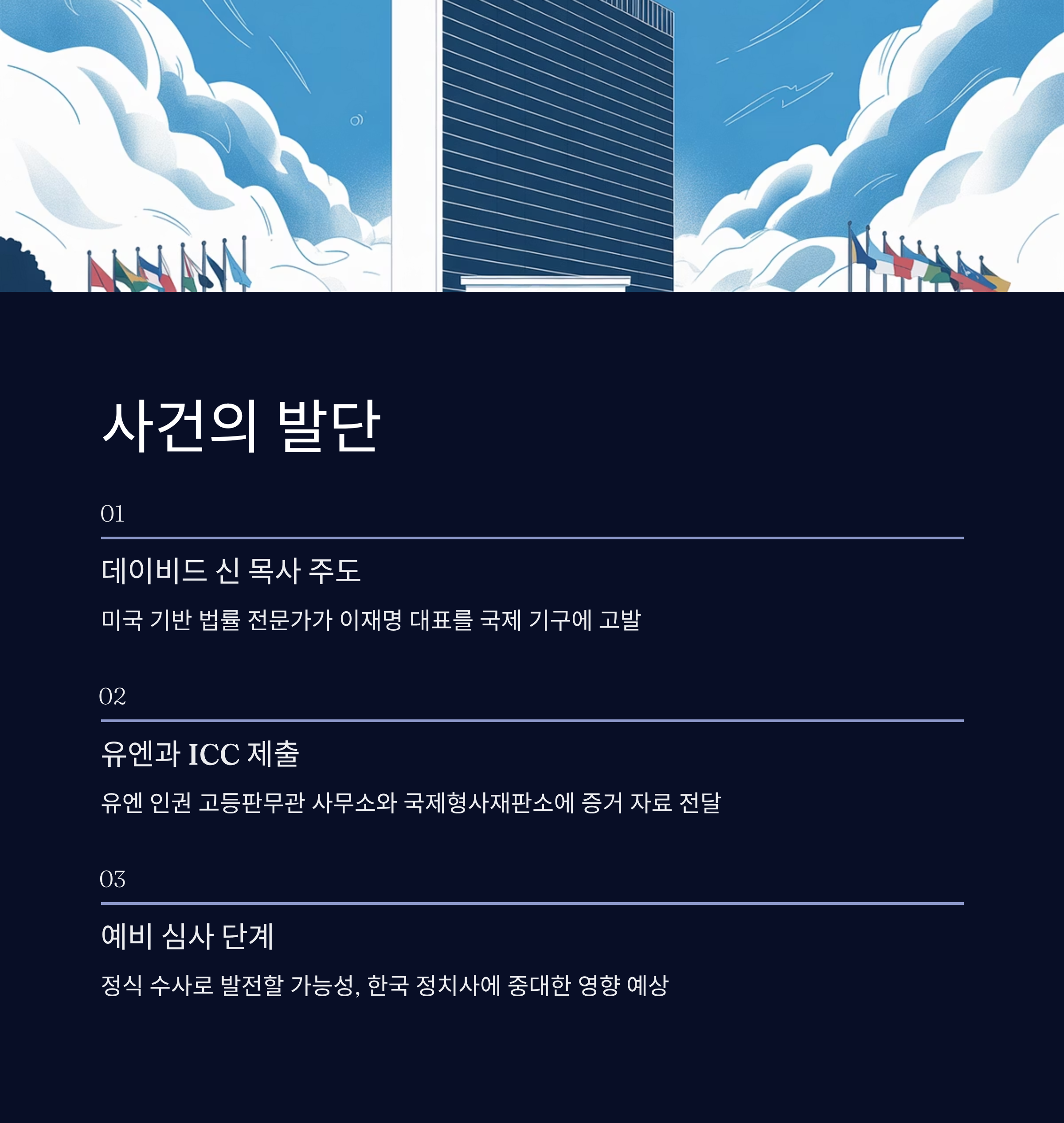 성남시장 출신의 이재명 더불어민주당 대표가 최근 국제적 논란의 중심에 서게 되면서 한국 정치와 국제 사회의 상호 연관성이 새로운 이슈로 떠오르고 있습니다. 사안의 발단은 미국 데이비드 신 목사가 주도한 국제 고발로, 이재명 대표를 북한과의 대북 송금 관련 혐의로 특정 국제 기구에 고발한 것입니다. 이번 고발은 단순히 국내적 사법 체계를 넘어 국제법과 유엔의 관점에서 이루어진다는 점에서 특별한 주목을 받고 있습니다. 미국의 법률 전문가 및 관계자는 이 고발이 유엔 인권 고등판무관 사무소와 국제 형사 재판소에 제출되었으며, 이는 통상적인 정치적 청원과 달리 법적인 증거를 수반한 자료로 처리된다고 밝혔습니다. 본 사건은 국제 형사 재판소(ICC)에서의 예비 심사를 거쳐 정식 수사로 발전할 가능성이 있다는 점에서 한국 정치사에 큰 영향을 미칠 수 있습니다. 이 글에서는 대북 송금 의혹과 관련된 주요 문제를 분석하고, 국제적 법적 구조 및 조사 가능성을 검토하며 이 사건의 장기적 영향을 조명하고자 합니다.