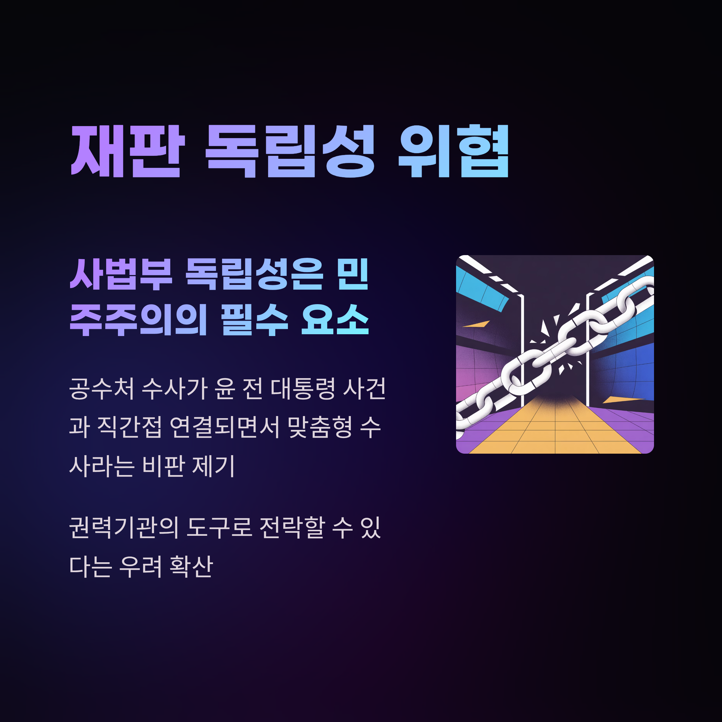 많은 사람들은 공수처의 개입이 사법부 독립성을 해치고, 정치적 의도를 가지고 있어 재판 결과에 악영향을 미칠 수 있다고 우려를 표명하고 있습니다.