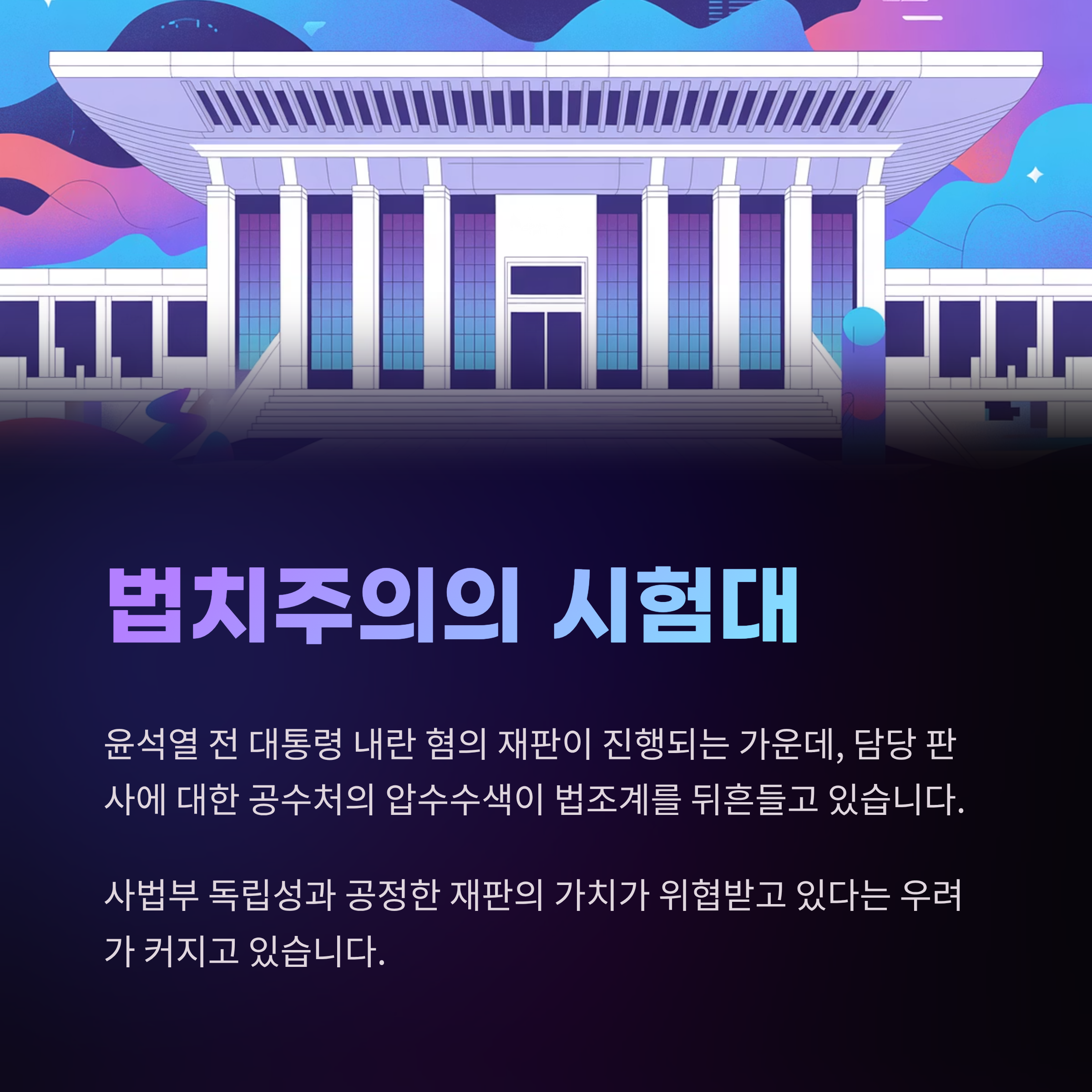 최근 대한민국은 윤석열 전 대통령을 둘러싼 내란 혐의 재판으로 뜨겁습니다. 이와 더불어 재판을 담당하는 지귀연 부장판사를 대상으로 진행된 공수처의 압수수색과 수사는 법조계를 크게 뒤흔들었습니다. 이러한 상황은 사법부의 독립성과 법치주의를 다시금 생각하게 만듭니다. 공수처는 객관적 수사라 주장하나, 그 타이밍과 수단을 둘러싸고 윤 전 대통령 구속 및 선고 기간에 맞춰 의도적 압박을 가하는 것이 아니냐는 의혹이 제기됩니다. 대한민국 사회 전반에 불신의 바람을 불러일으키는 이번 사태를 통해, 공정한 재판과 법적 절차의 중요성이 얼마나 중대한지 탐구해보도록 하겠습니다.