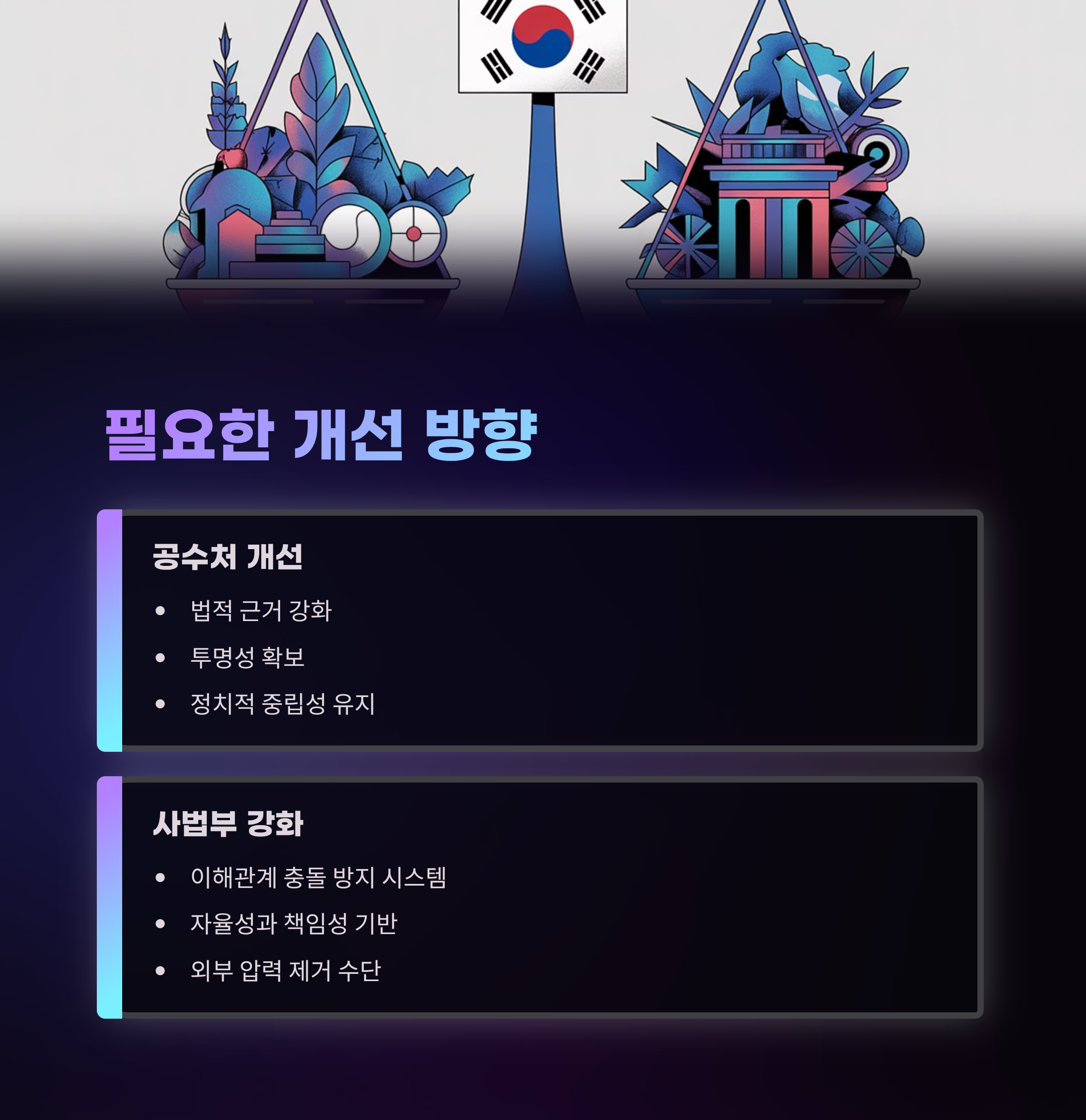 결론적으로, 공수처는 초기에 설정했던 독립성과 신뢰성을 유지할 수 있도록 수사 방식을 단순한 비리 적발에서 법적 근거와 투명성에 더욱 중점을 두는 방향으로 개선해야 합니다. 동시에 사법부도 자율성과 책임성을 기반으로 신뢰성을 회복해야 하며, 이를 위해 적절한 이해관계 충돌 방지 시스템 도입 등이 필요할 것입니다.