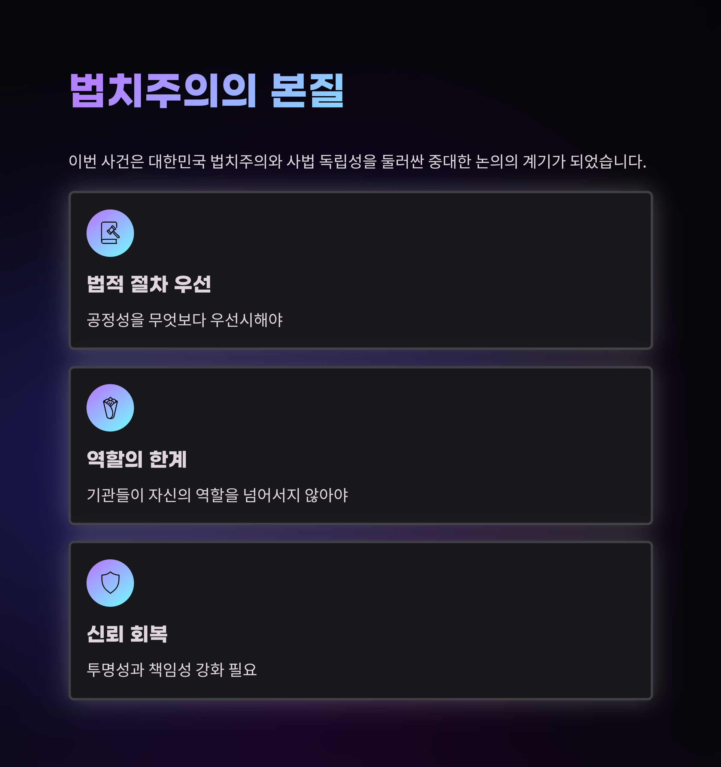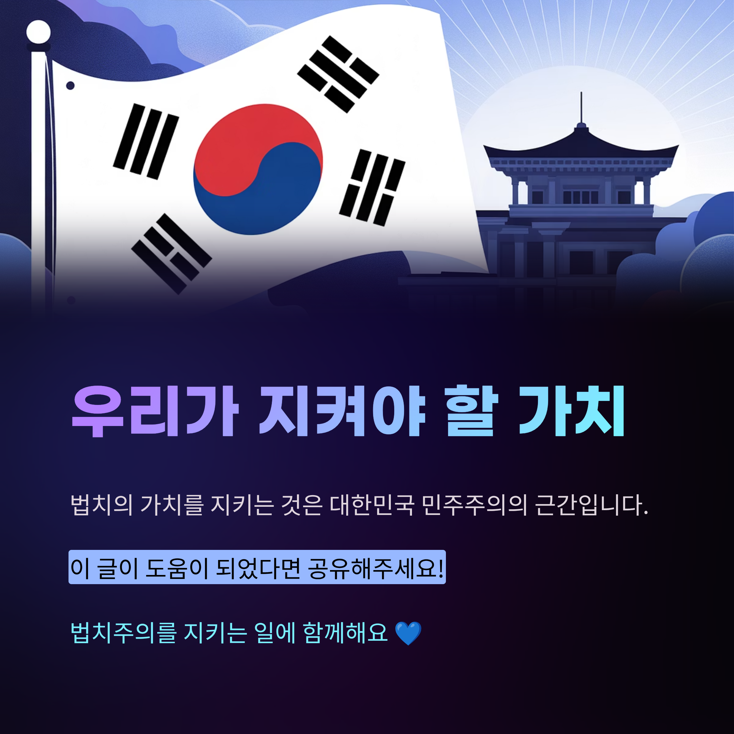 대한민국은 법치의 가치를 지키는 데 있어 내부적, 외부적 과제를 동시에 직면하고 있습니다. 이번 사건을 통해 교훈을 삼아야 한다면, 법을 집행하고 해석하는 기관들이 자신의 역할을 넘어서지 않는다는 점, 그리고 법적 절차와 공정성을 무엇보다도 우선시해야 한다는 점을 잊어서는 안 될 것입니다.