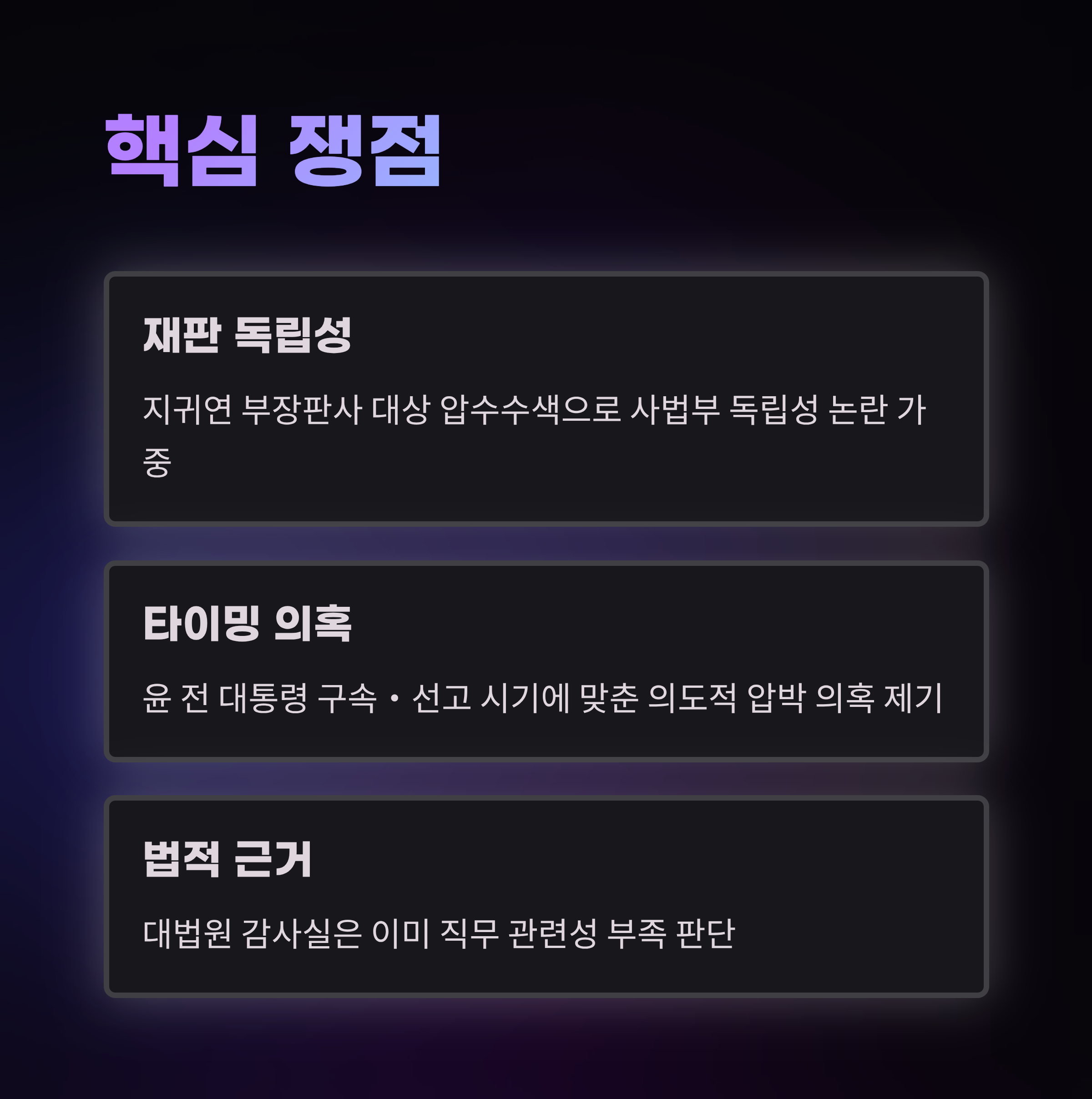 공수처는 재판을 담당하는 지귀연 부장판사의 잠재적 법적 문제를 조사하며 압수수색을 시행했지만, 관련 의혹은 법적 근거가 부족하다는 비판에 놓였습니다.
