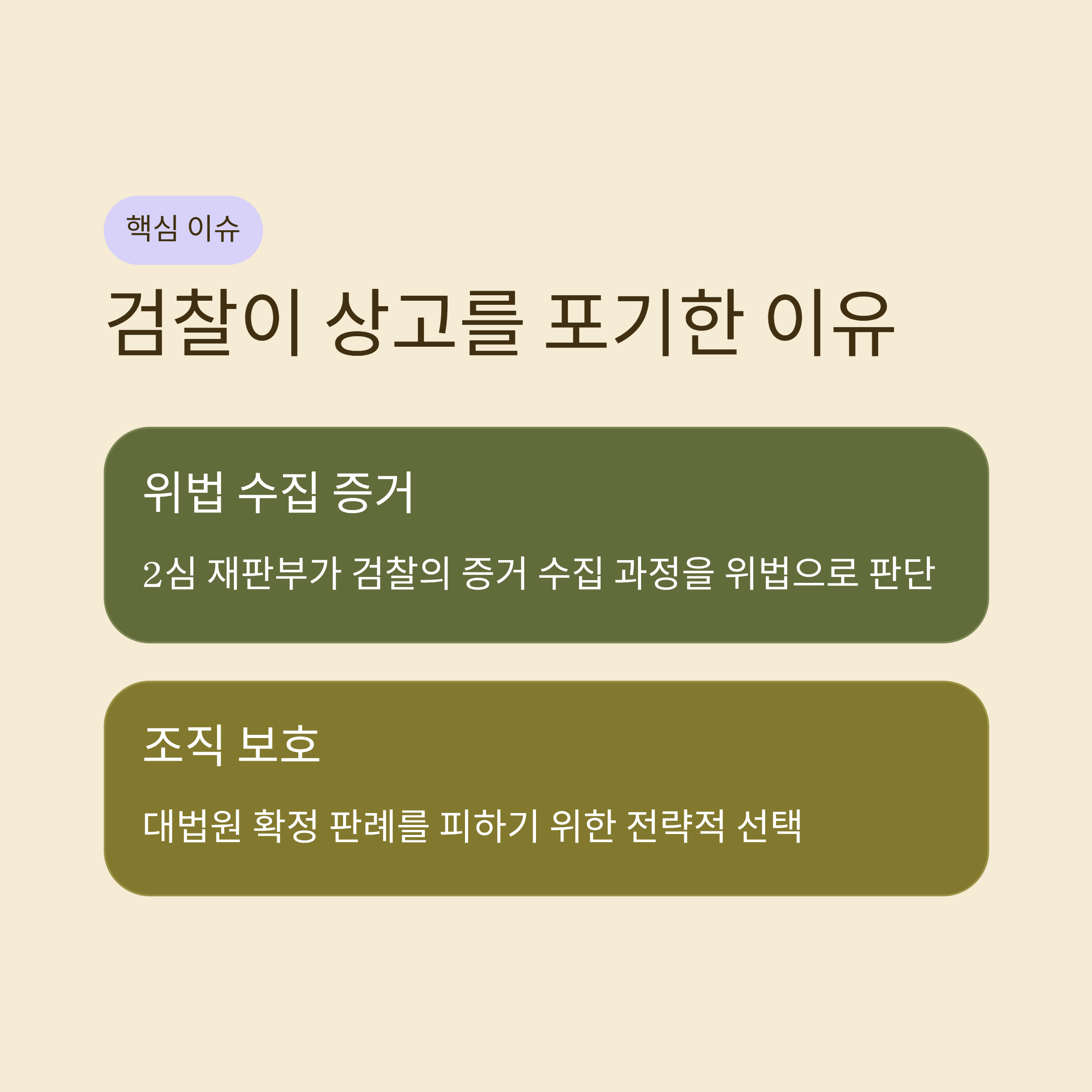 | A. 항소심(2심) 재판부가 검찰의 증거 수집 과정을 '위법'하다고 판단했기 때문입니다. 검찰 입장에서는 대법원까지 가서 '위법 수사'라는 판례를 확정 짓는 것보다, 상고를 포기하여 사건을 조용히 종결시키는 것이 조직 보호 차원에서 유리하다고 판단한 것으로 보입니다. |
