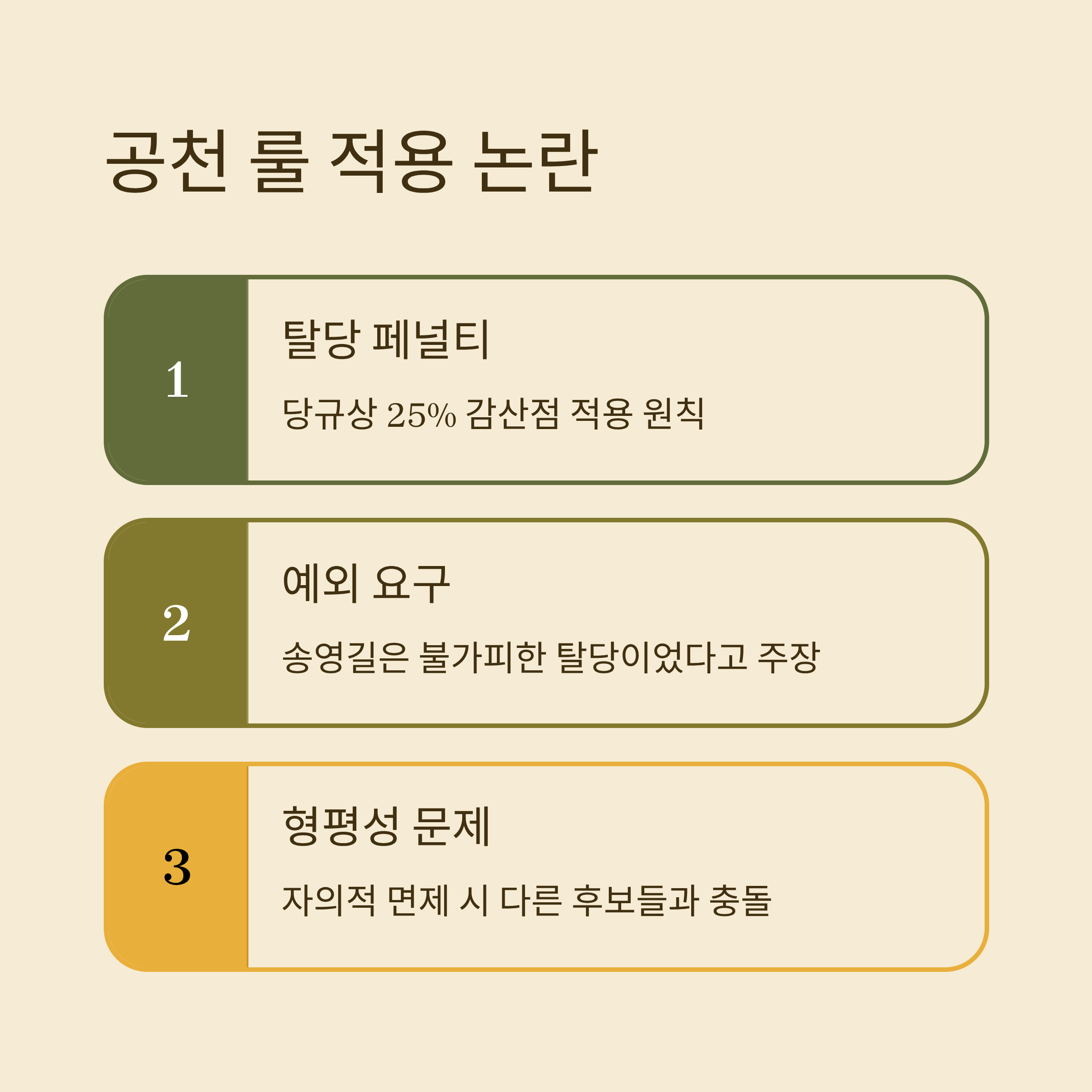 | A. 탈당 경력자에 대한 공천 감산점(25%) 적용 여부를 두고 형평성 시비가 일어날 수 있습니다. 또한, 특정 지역구를 송영길-이재명-김남준(또는 송영길) 순으로 주고받는 모습이 '기득권 정치'와 '지역구 사유화'로 비쳐 중도층 민심에 악영향을 줄 우려가 큽니다. |