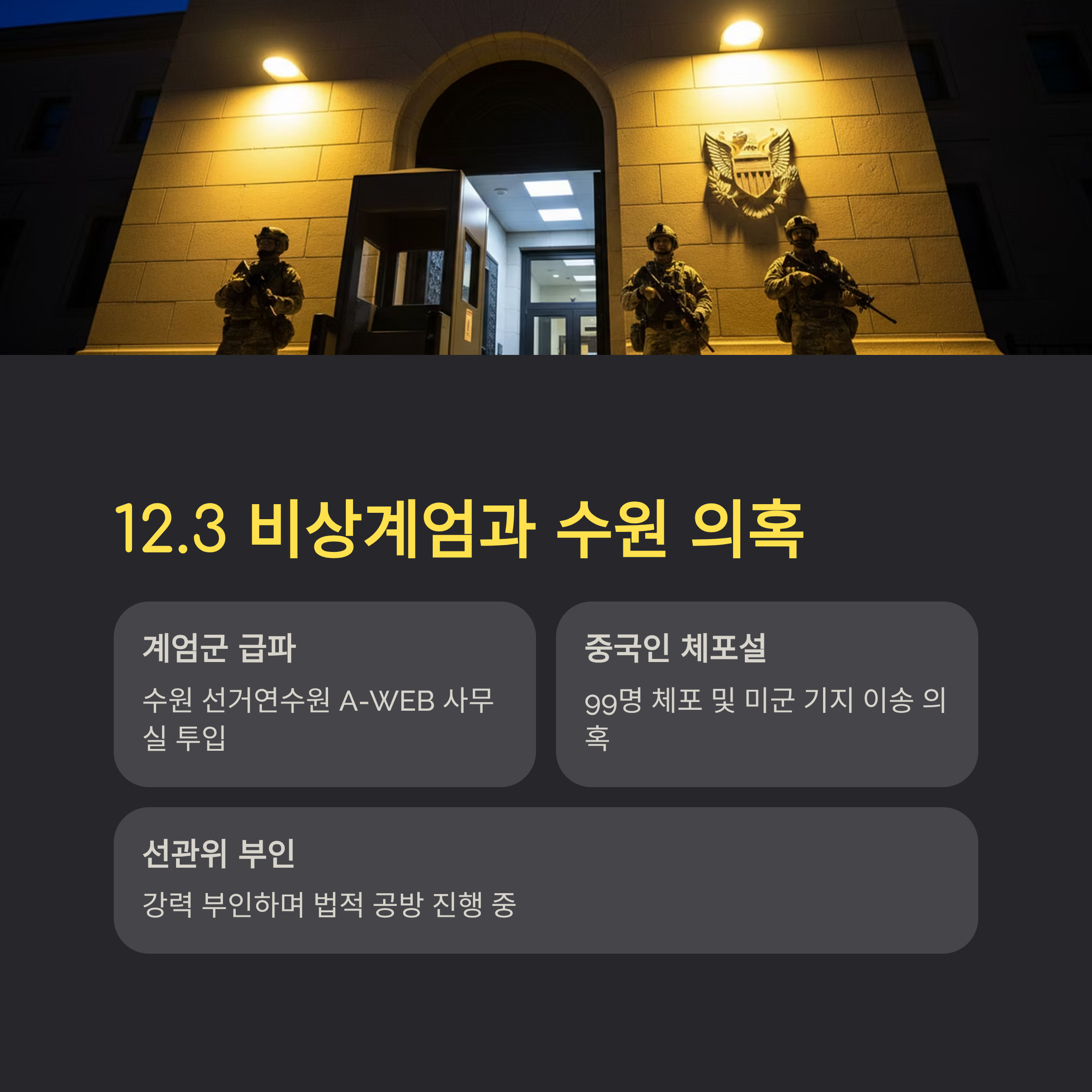 - 1. 서론: 12.3 비상계엄과 수원 연수원 의혹의 재점화