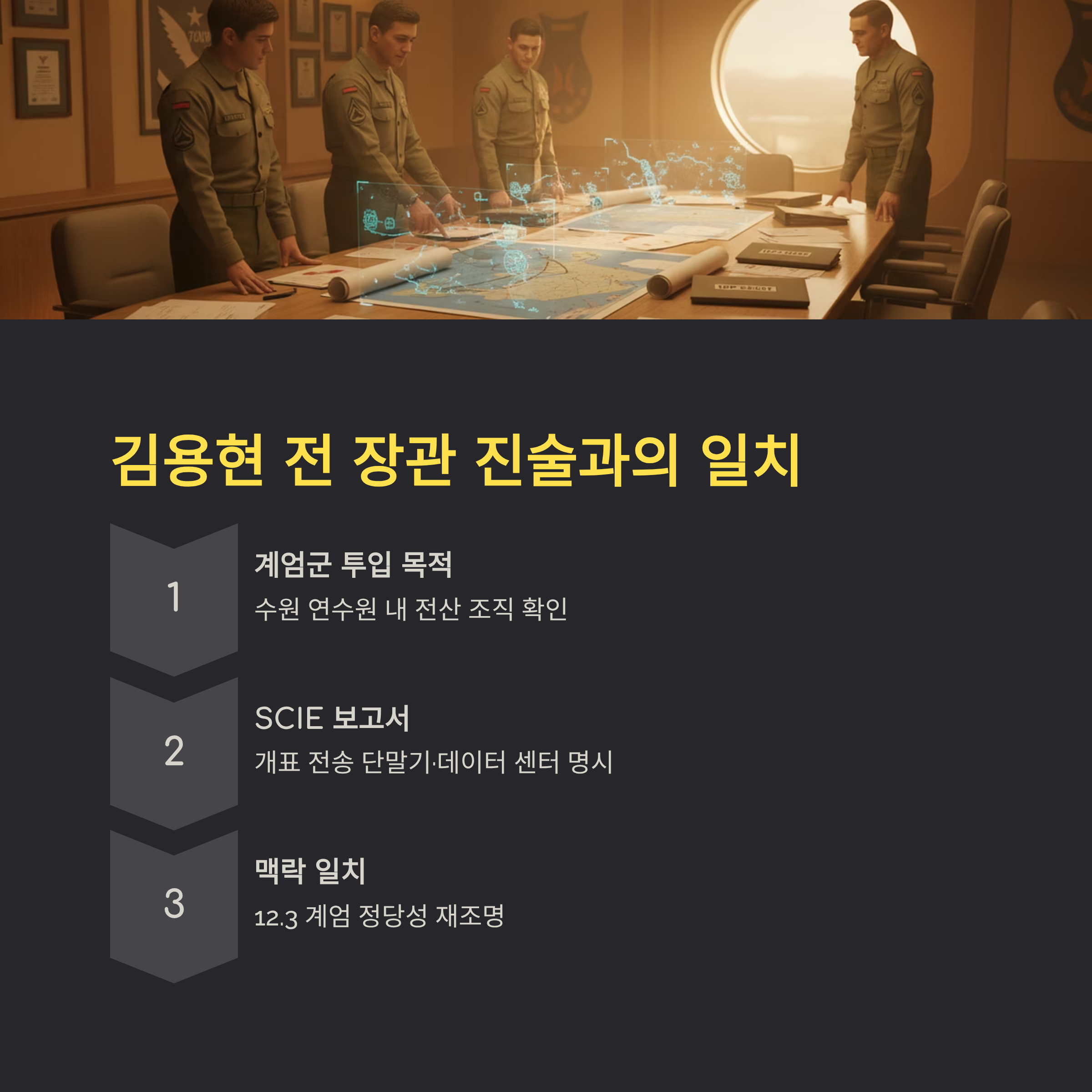 김용현 전 국방부 장관 측이 언급했던 "수원 연수원 내 전산 조직 확인 목적의 계엄군 투입" 진술과 SCIE 보고서의 맥락이 일치해 12.3 계엄과의 연관성이 주목받고 있습니다.