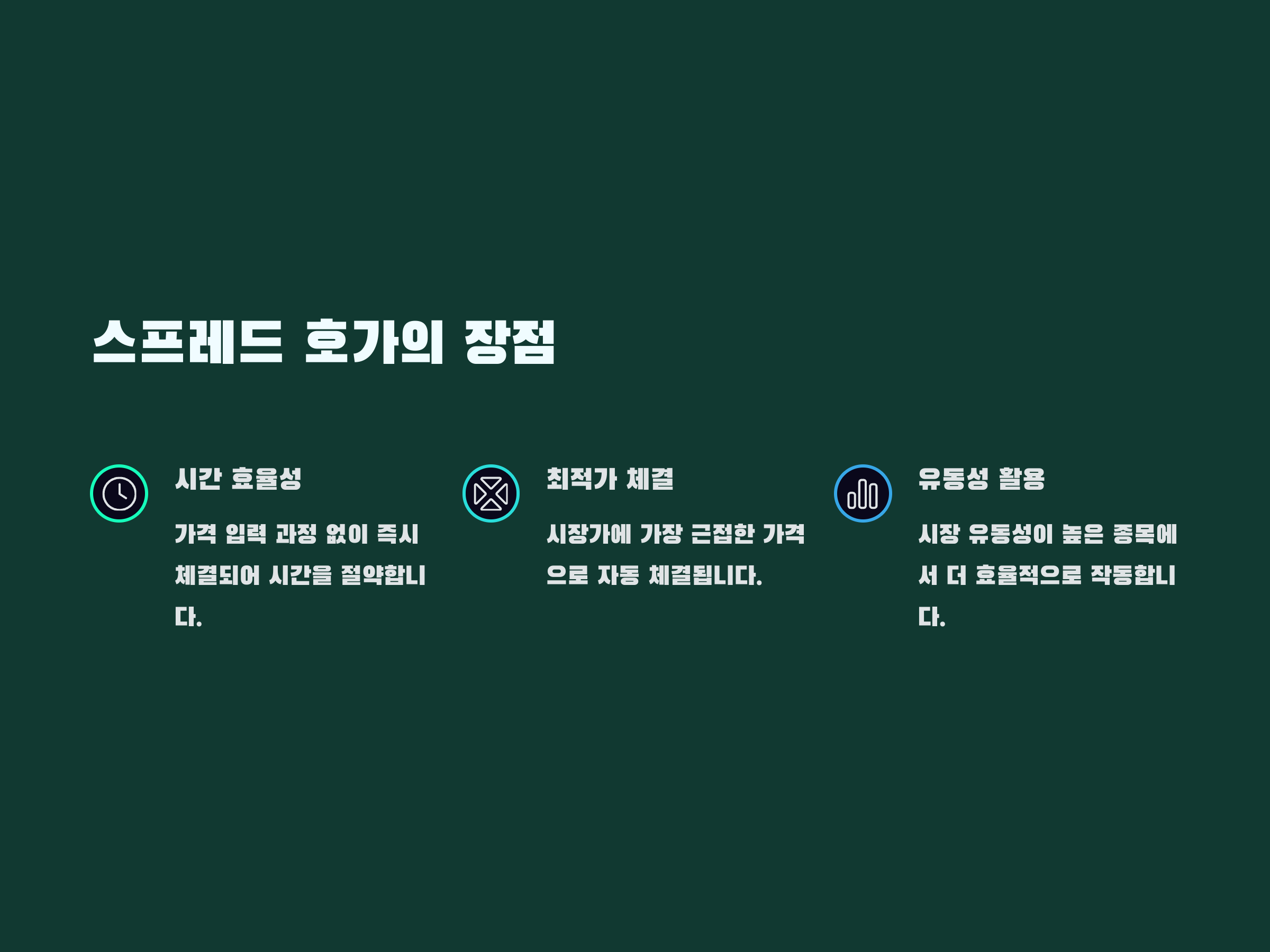 스프레드 호가란 투자자가 가격을 직접 입력하지 않아도, 상대방 매도/매수 호가에 맞춰 자동으로 체결되도록 하는 자동 상대호가 매칭 방식입니다. 가격 격차(스프레드)가 좁을수록 유리하게 체결되며, 시장 유동성이 높은 종목일수록 효율적인 체결이 가능합니다.