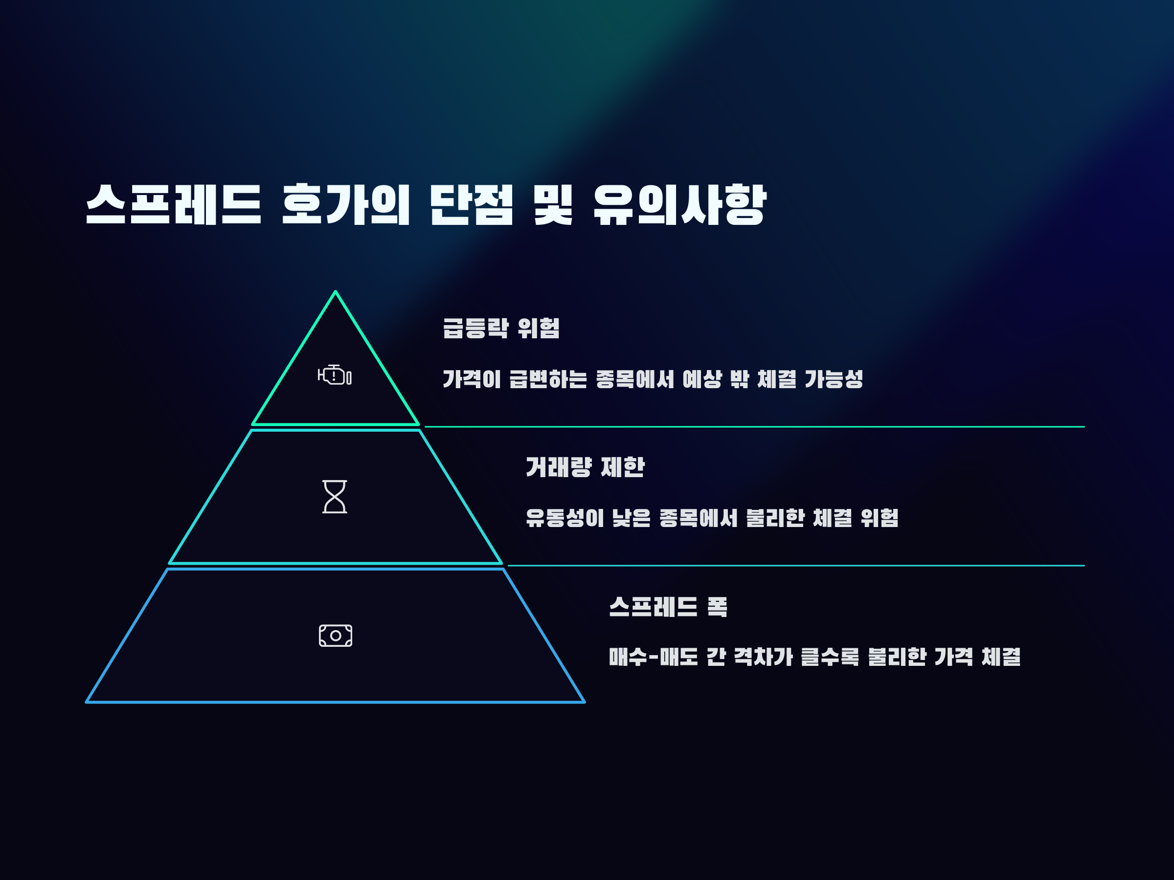 하지만 스프레드 호가 방식은 항상 유리한 것만은 아닙니다. 호가창이 얇거나 유동성이 낮은 종목의 경우, 불리한 가격에 체결될 가능성이 있습니다. 특히 급등락하는 종목에서는 예기치 않은 가격에 거래가 체결되어 손실로 이어질 수 있으므로, 시장 상황에 대한 판단이 반드시 필요합니다.