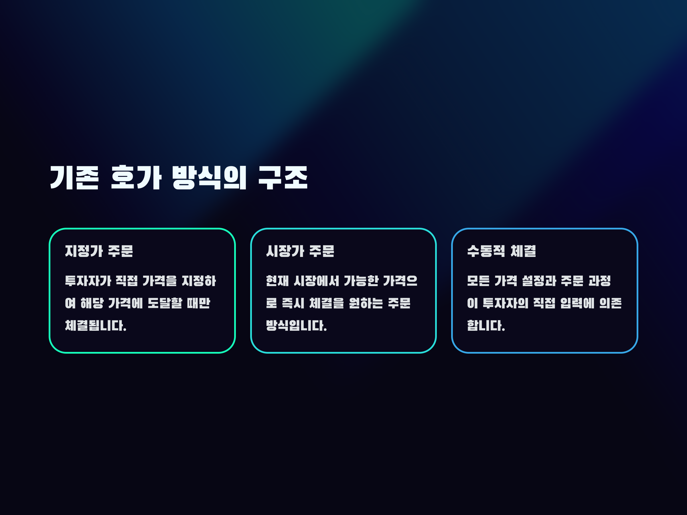 | 가격 설정 | 투자자가 직접 입력 | 상대 호가 기준 자동 지정 |