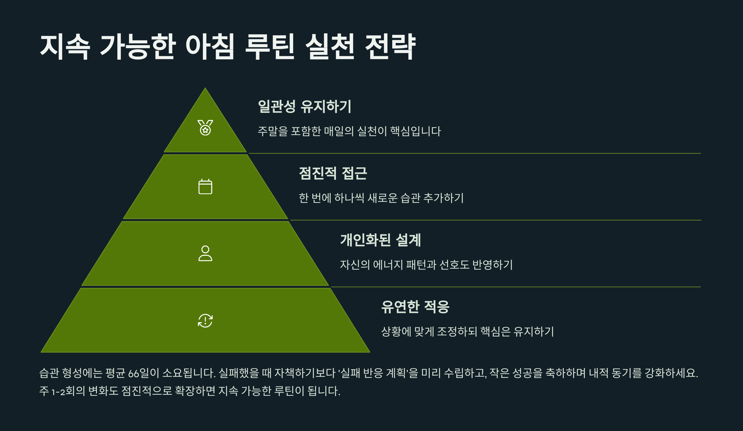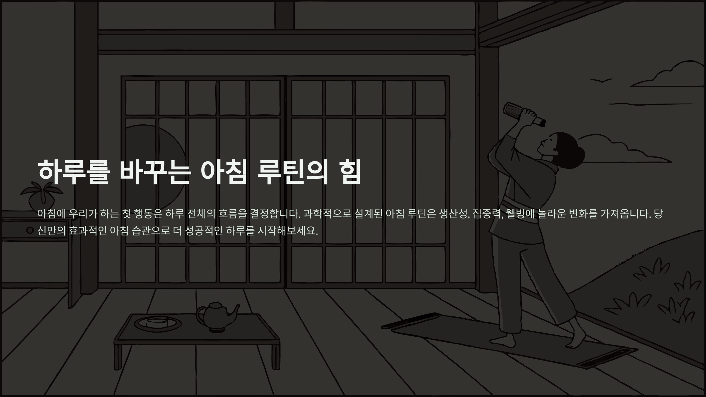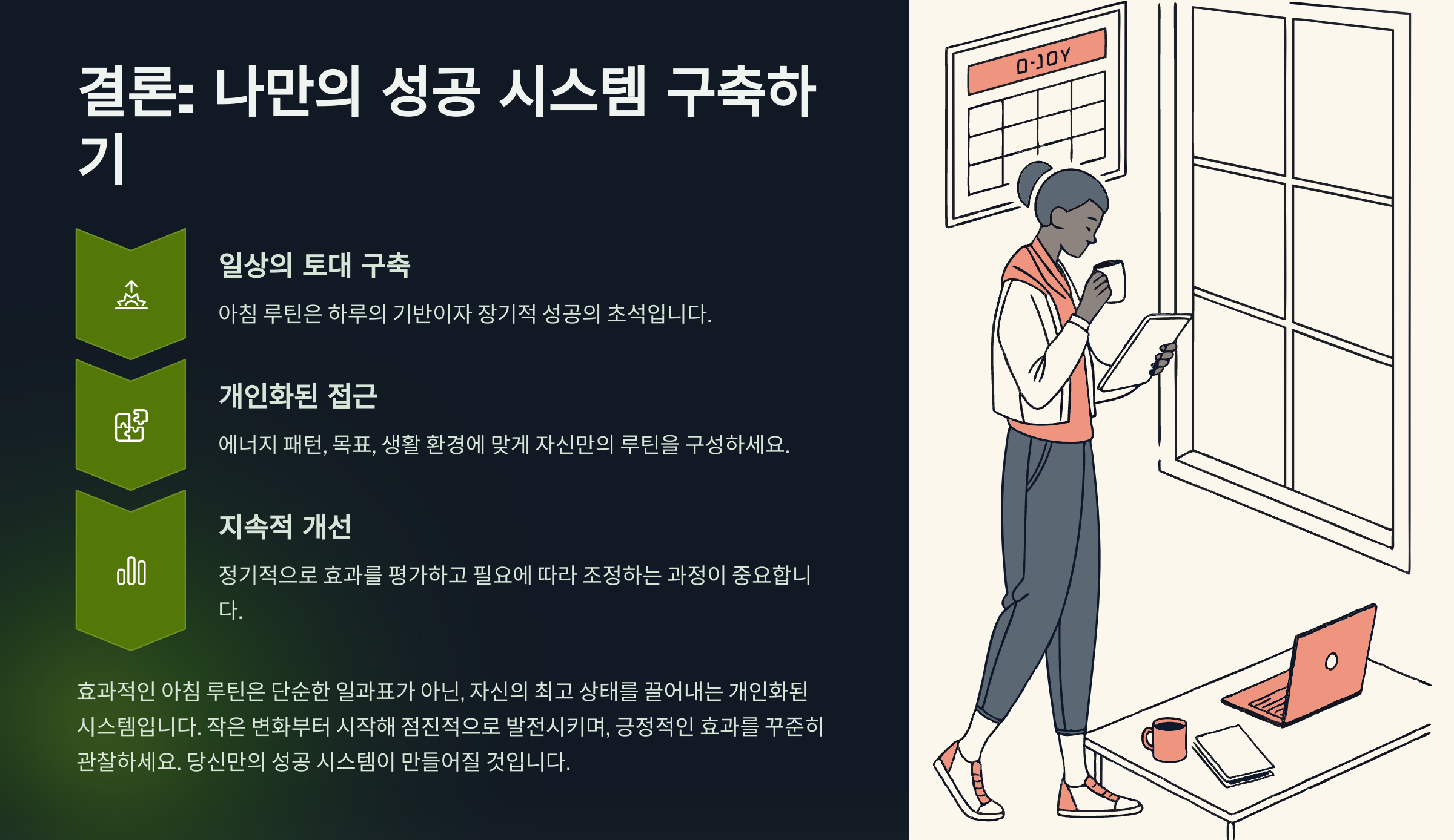 이제 여러분만의 라이프스타일에 맞는 아침 루틴을 설계해보세요. 루틴은 삶을 통제하고 성장시키는 강력한 도구입니다.