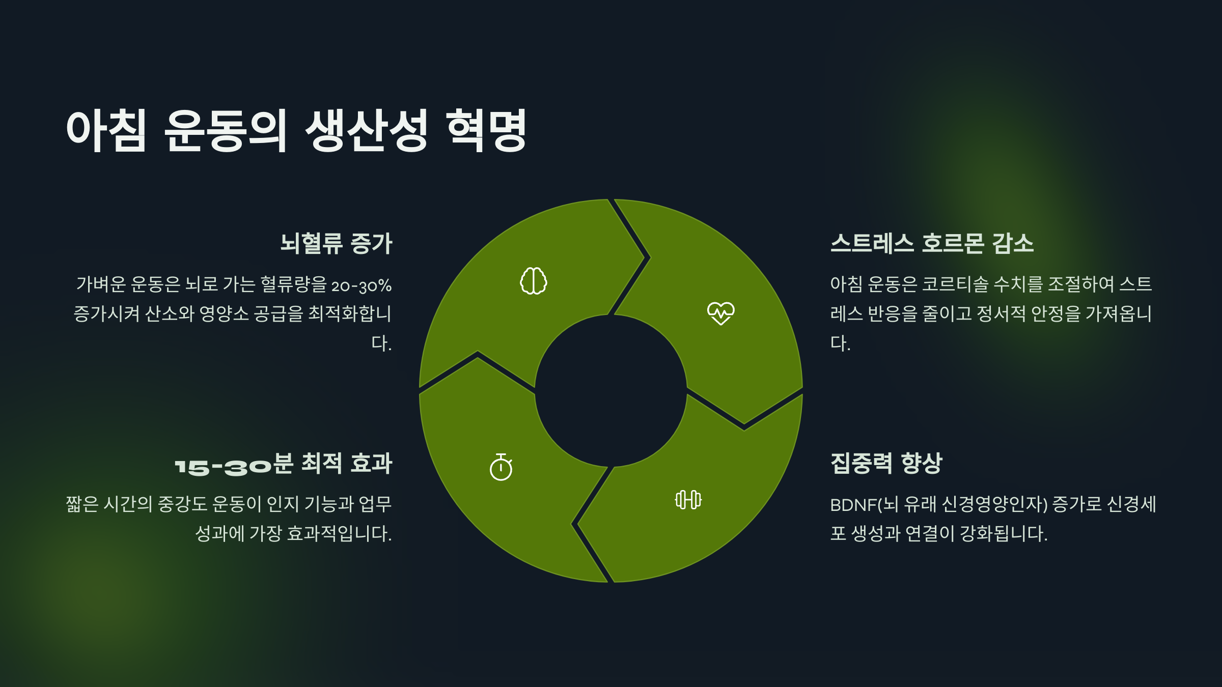 특히 아침 운동은 뇌혈류 증가, 도파민 분비 촉진, 스트레스 호르몬 감소, 신경가소성 향상 등 다양한 생리적 효과를 통해 집중력을 극대화합니다. 이는 단순한 체력 관리 이상의 효과로, 실제 업무 성과 향상과 밀접한 관련이 있습니다.