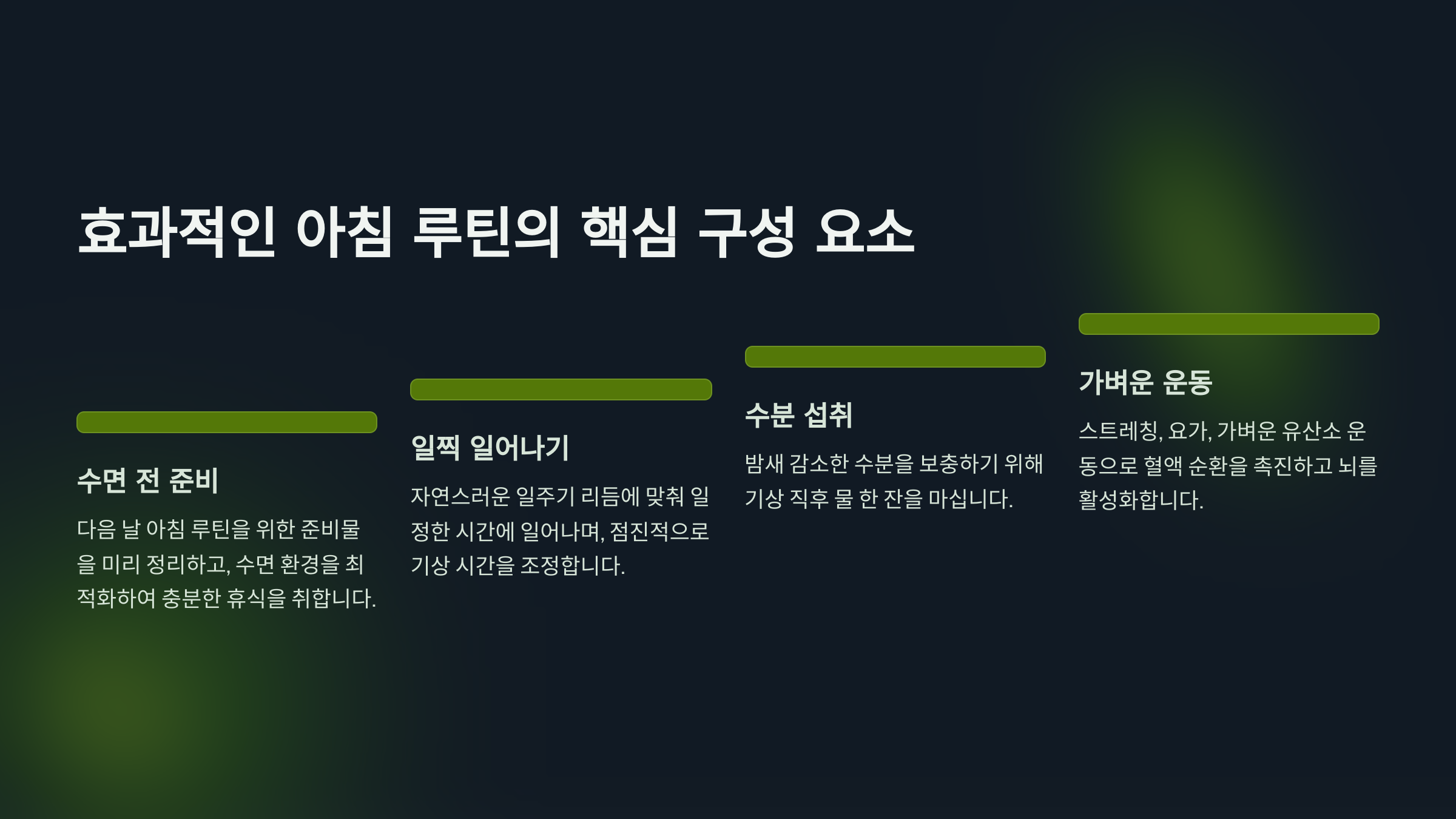 아침 루틴의 핵심은 반복성과 실현 가능성입니다. 먼저 전날 저녁 준비를 통해 아침의 스트레스를 줄이고, 일찍 기상함으로써 자기 통제력을 높일 수 있습니다. 기상 직후 물 한 잔은 수분 손실을 보충하고 뇌 기능을 활성화하며, 가벼운 운동은 심박수를 올리고 기분을 좋게 합니다.