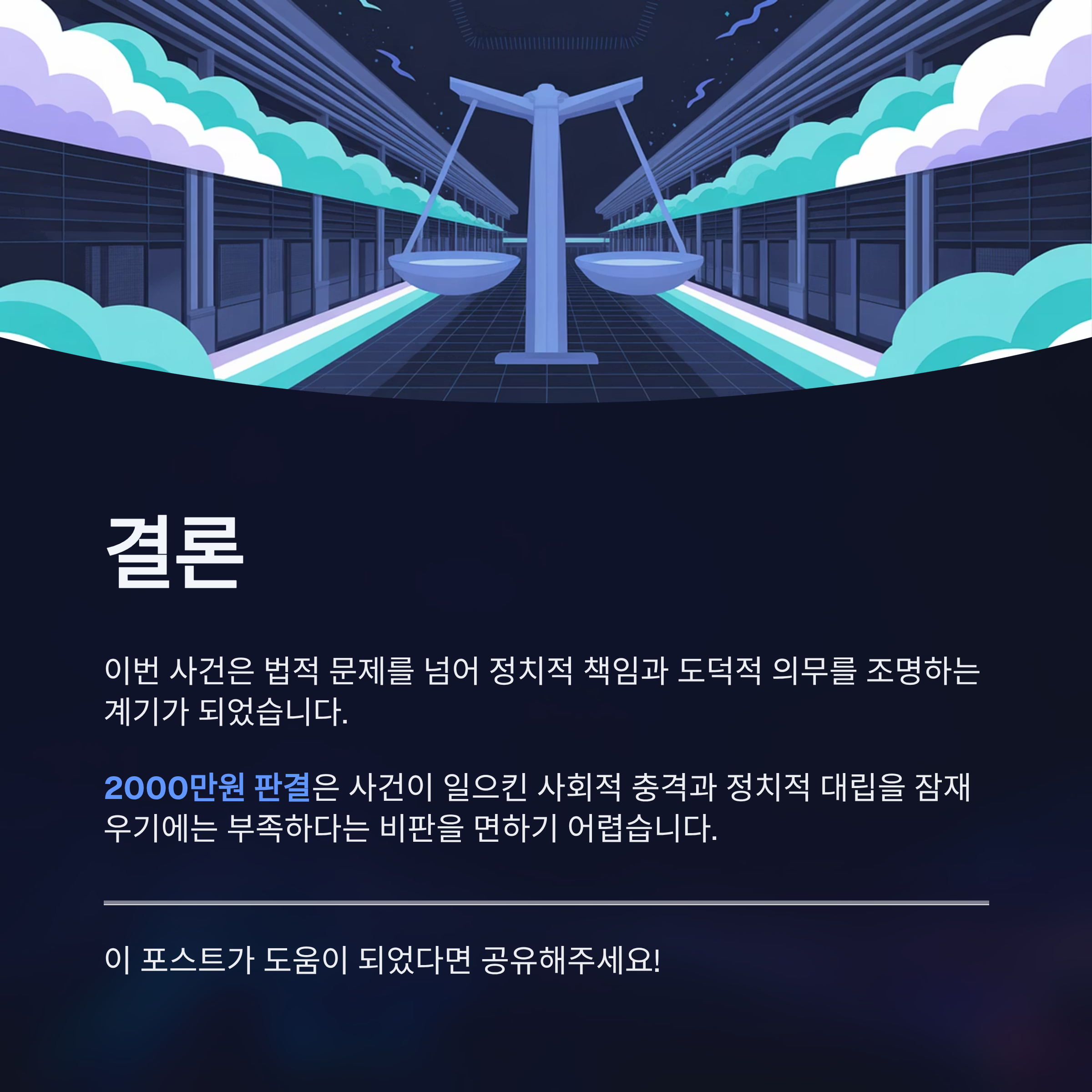이번 사건과 논란은 법적 문제를 넘어 정치적 책임과 도덕적 의무를 조명하는 계기가 되었습니다. 안민석 의원의 활동은 공익적 의도와 정치적 의도 사이의 긴장 속에서 이루어진 것으로 볼 수 있습니다. 대법원의 최종 판단은 법적 기준을 정립하고 공적인 위치에 선 사람들에게 신중한 사실 확인과 발언 책임을 요구하는 메시지를 담고 있습니다. 그러나 벌금 2000만 원이라는 결론은 여전히 사건이 일으킨 사회적 충격과 정치적 대립을 잠재우기에는 부족하다는 비판을 면하기 어렵습니다. 앞으로 이러한 사례가 반복되지 않도록 공정한 법의 적용과 국민의 신뢰 회복이 필요합니다.